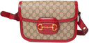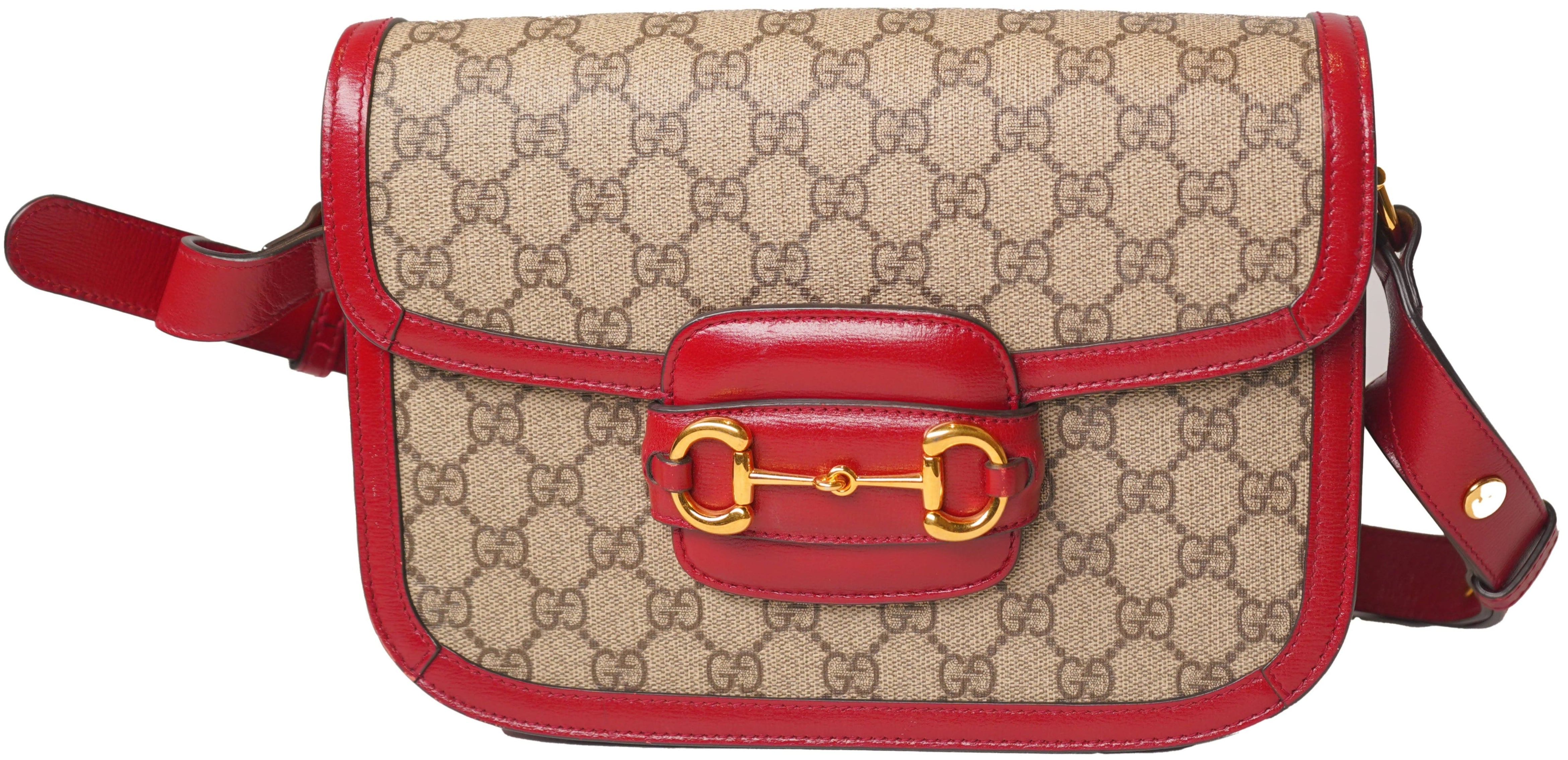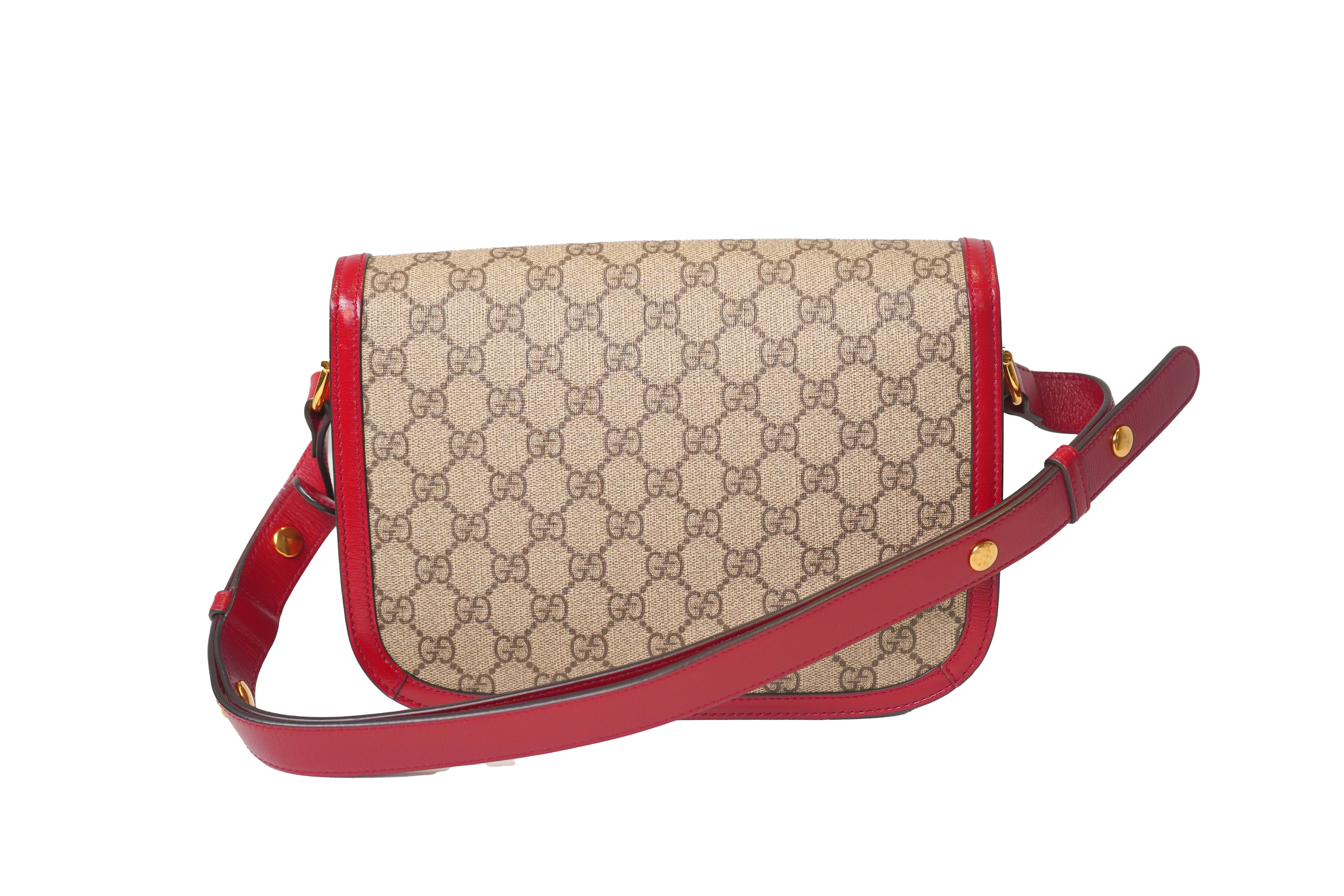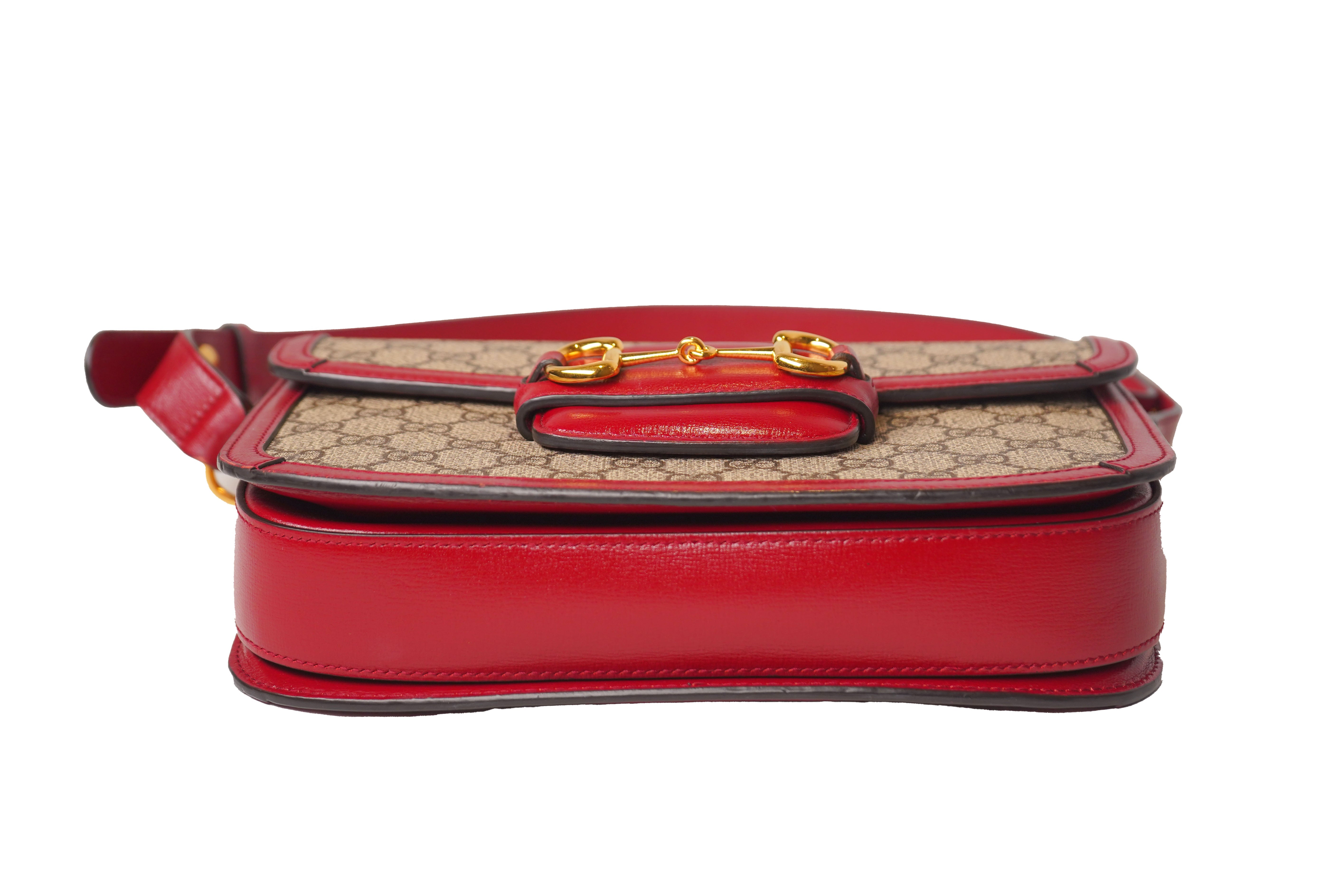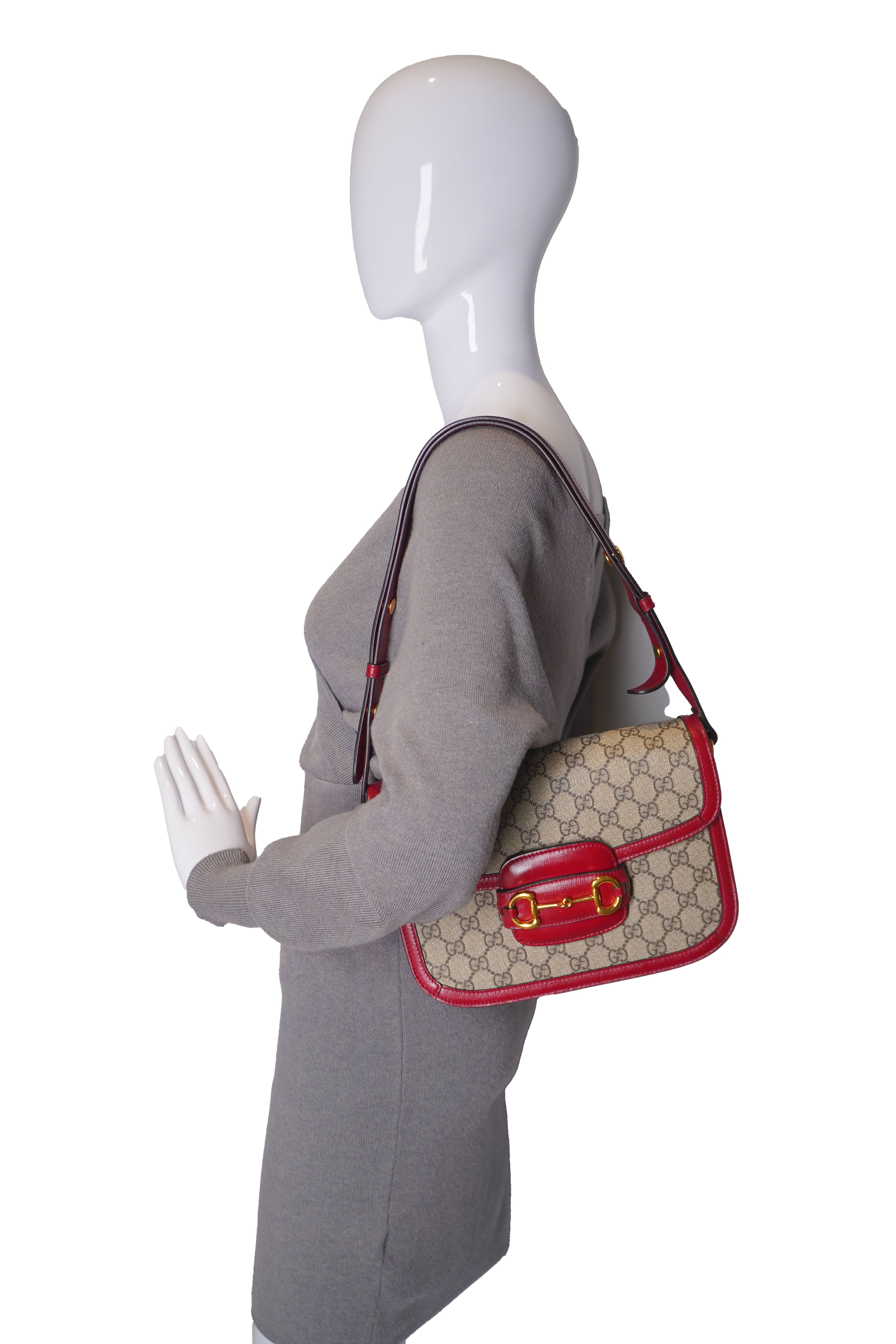 This is an authentic GUCCI GG Supreme Monogram Azalea Calfskin Horsebit 1955 Shoulder Bag in Beige, Ebony, and New Cherry Red. This stylish shoulder bag is crafted of Gucci GG supreme monogram canvas with red leather trim. The bag features a looping adjustable leather shoulder strap and gold horsebit detail on the front flap closure. The top flap opens to a compartmentalized beige fabric interior with zipper and patch pockets.