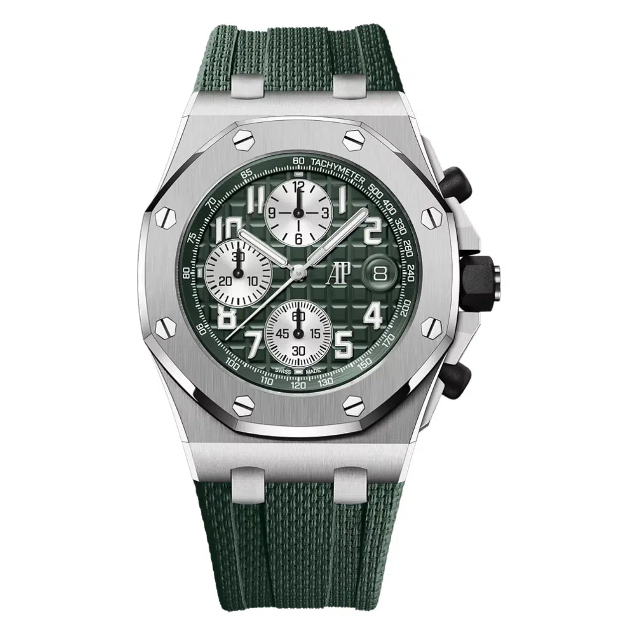 Khaki‑green dial inside a titanium 42 mm shell, fitted to rugged rubber; flyback chrono, date, 100 m rating—tactical chic for land or sea.