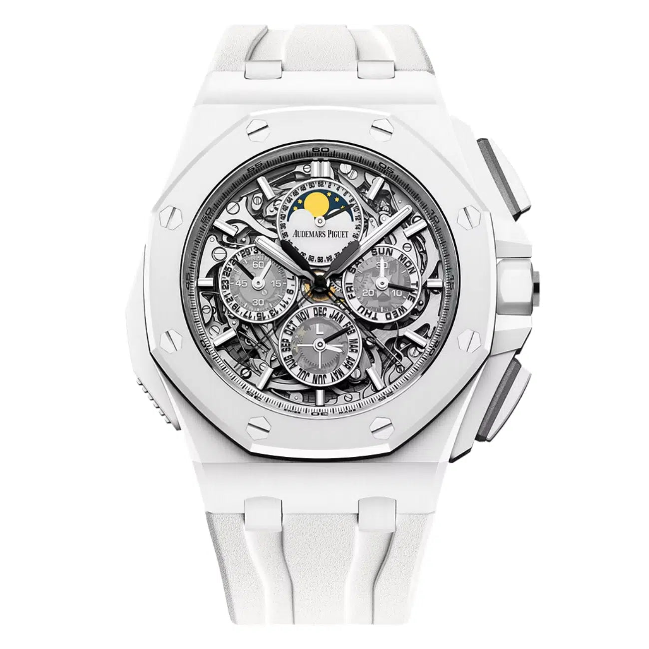 44 mm white‑ceramic Royal Oak Offshore on a matching rubber strap: sapphire dial showcases a minute repeater, perpetual calendar, and split‑seconds chronograph—an everyday‑wearable Grande Complication that commands instant respect.
