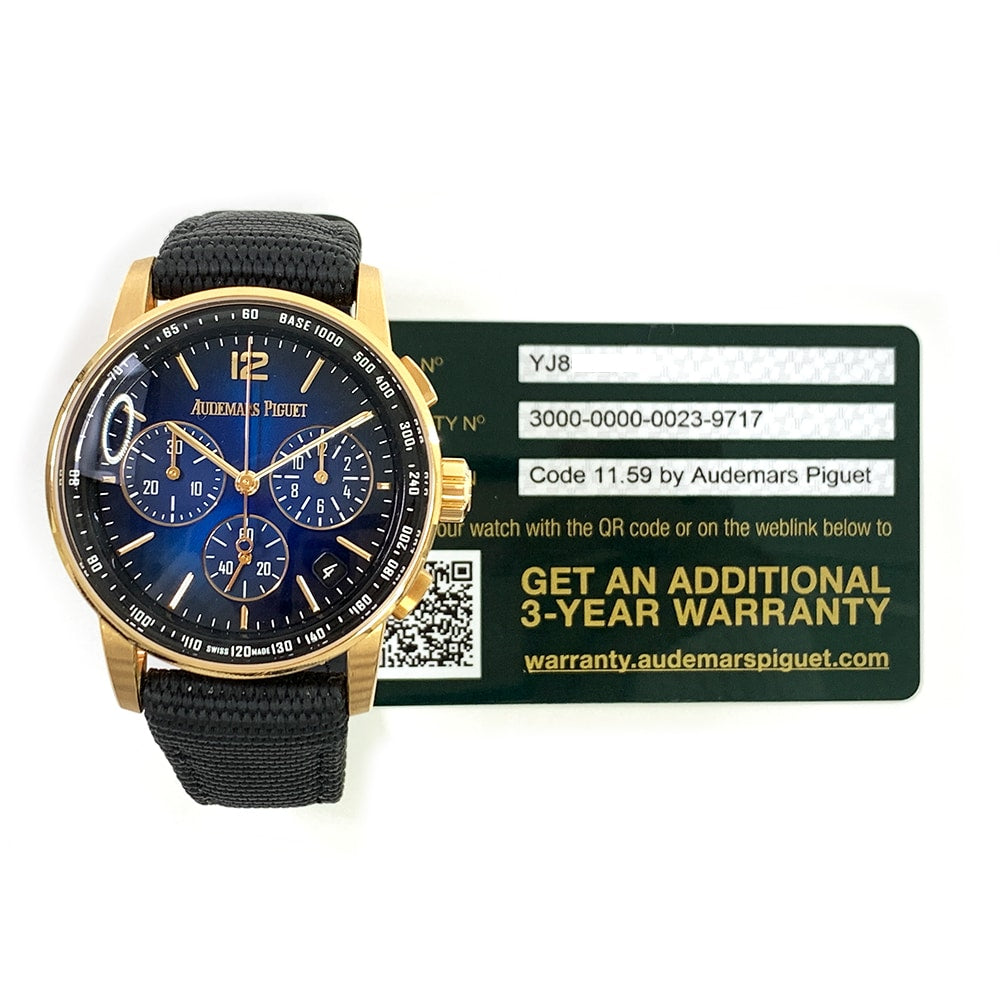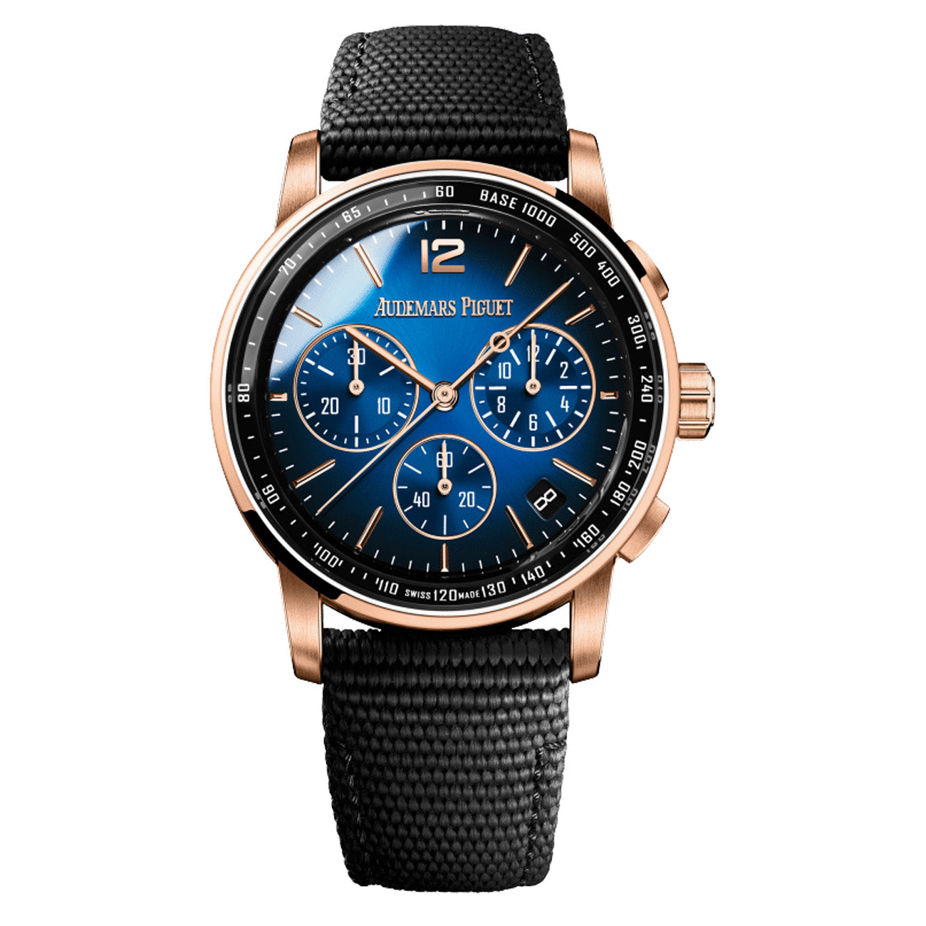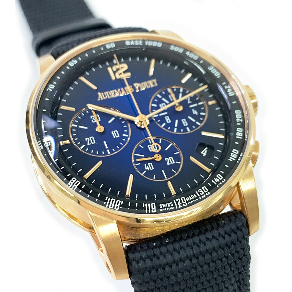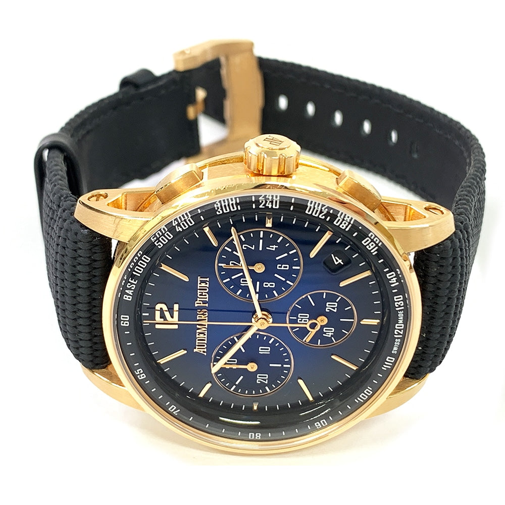 Audemars Piguet Code 11.59 Chronograph 26393OR.OO.A002KB.03 Rose Gold With Black Textile Watch Blue Dial 2021