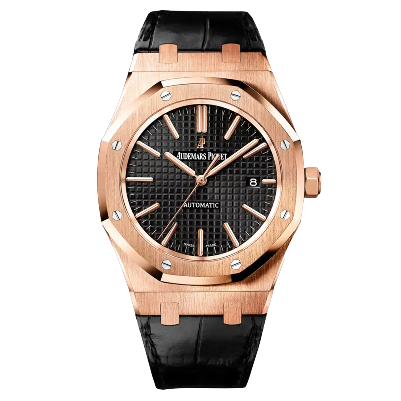 Audemars Piguet Royal Oak Selfwinding 15450OR.OO.D002CR.01. This elegant 37mm Royal Oak Selfwinding features an 18k rose gold case and bezel, paired with a black leather strap and matching black "Grande Tapisserie" dial. Powered by an automatic movement, it offers refined sophistication in a versatile unisex size. Complete with original box and papers.