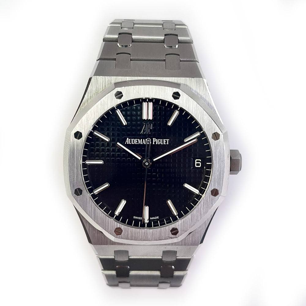 The Audemars Piguet Royal Oak 15500ST.OO.1220ST.03 men's or unisex timepiece, 41mm stainless steel case and the iconic ‘Grand Tapisserie' patterned black dial with luminescent silver-toned hands and lumiescent silver-toned index hour markers. Stainless steel bracelet with double-fold stainless steel clasp.