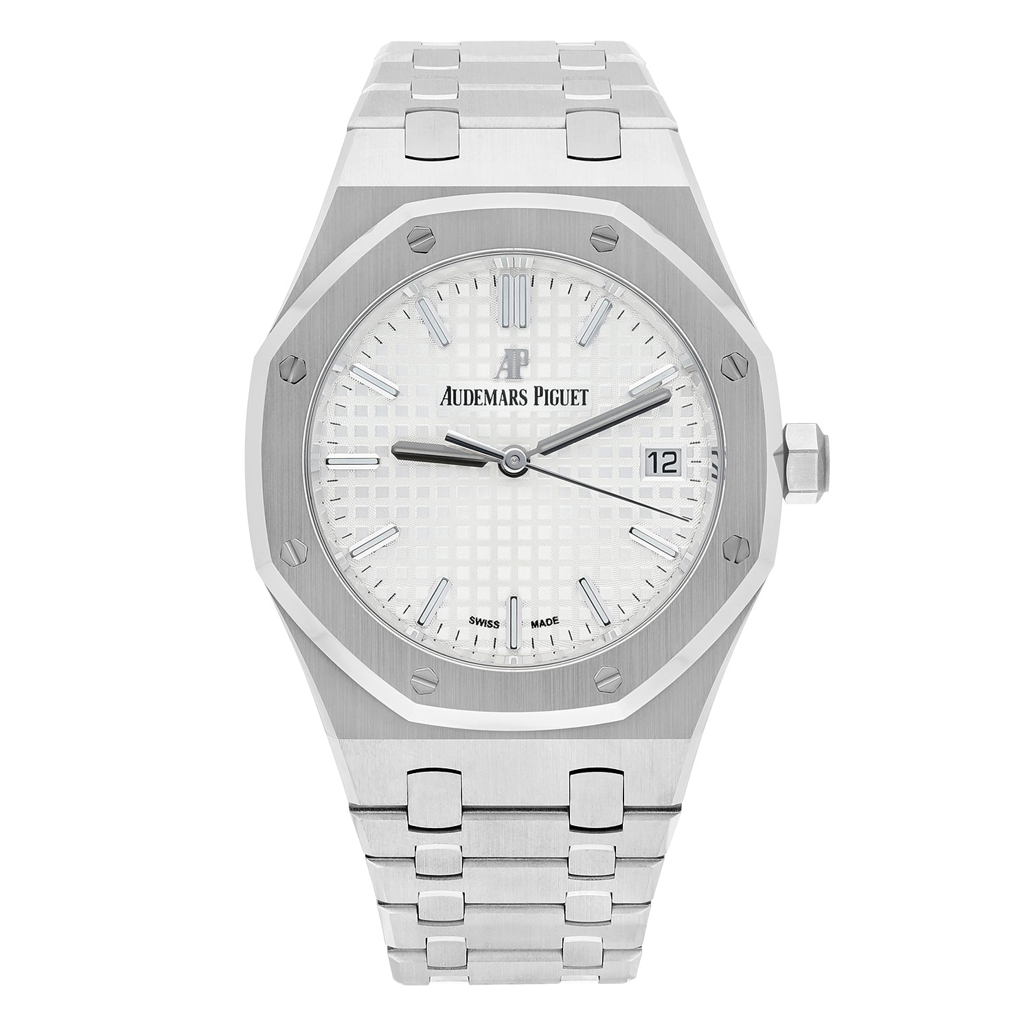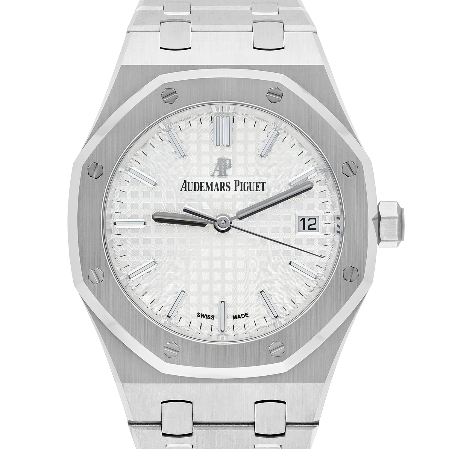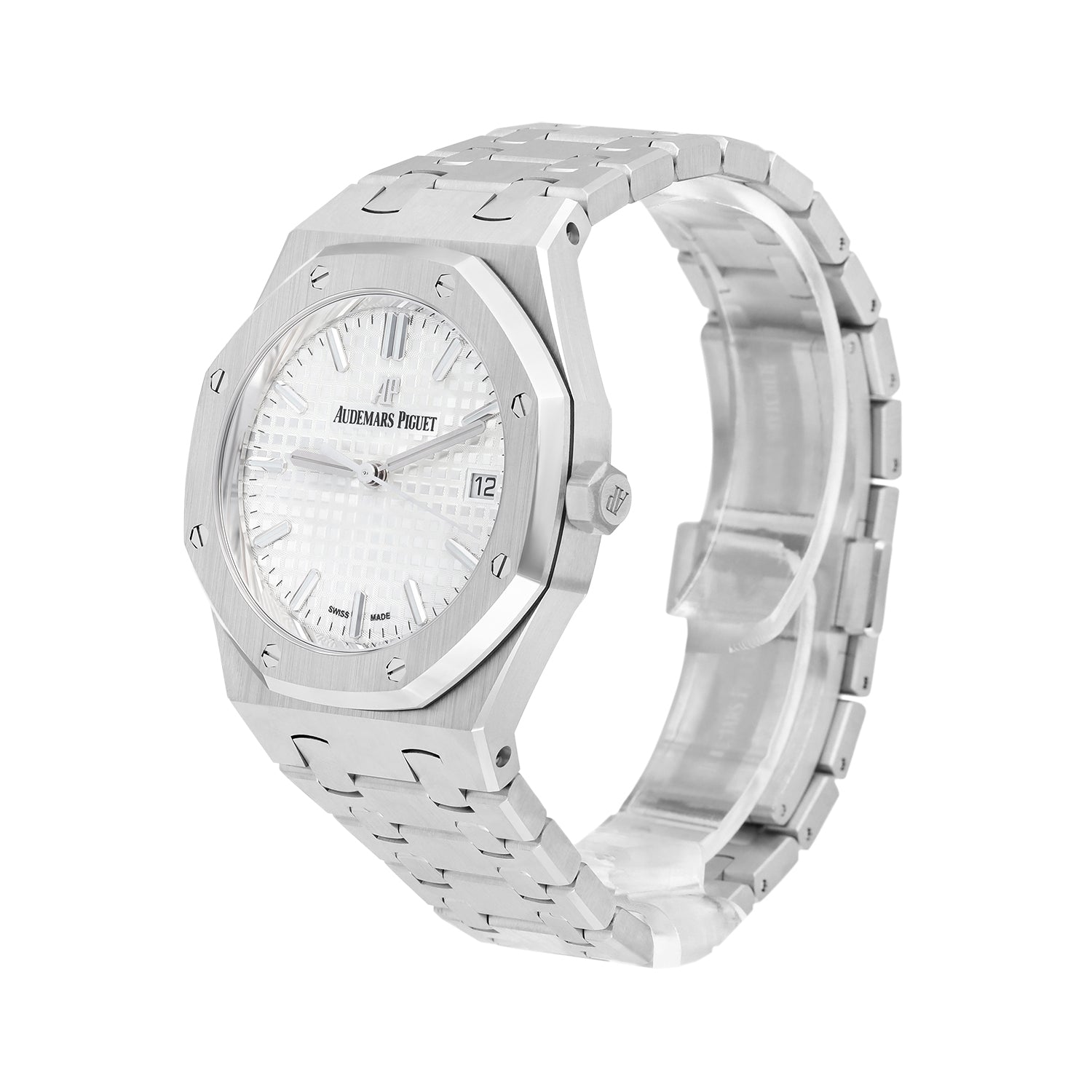 Stainless steel case with a silver-tone stainless steel bracelet. Fixed silver-tone stainless steel bezel. Silver-tone dial with index hour markers. Dial Type: Analog. Date display at the 3 o'clock position. Audemars Piguet Calibre 5800 Automatic movement, containing 28 Jewels, composed of 189 parts, bitting at 28800 vph, and has a power reserve of approximately 50 hours. Scratch resistant sapphire crystal.