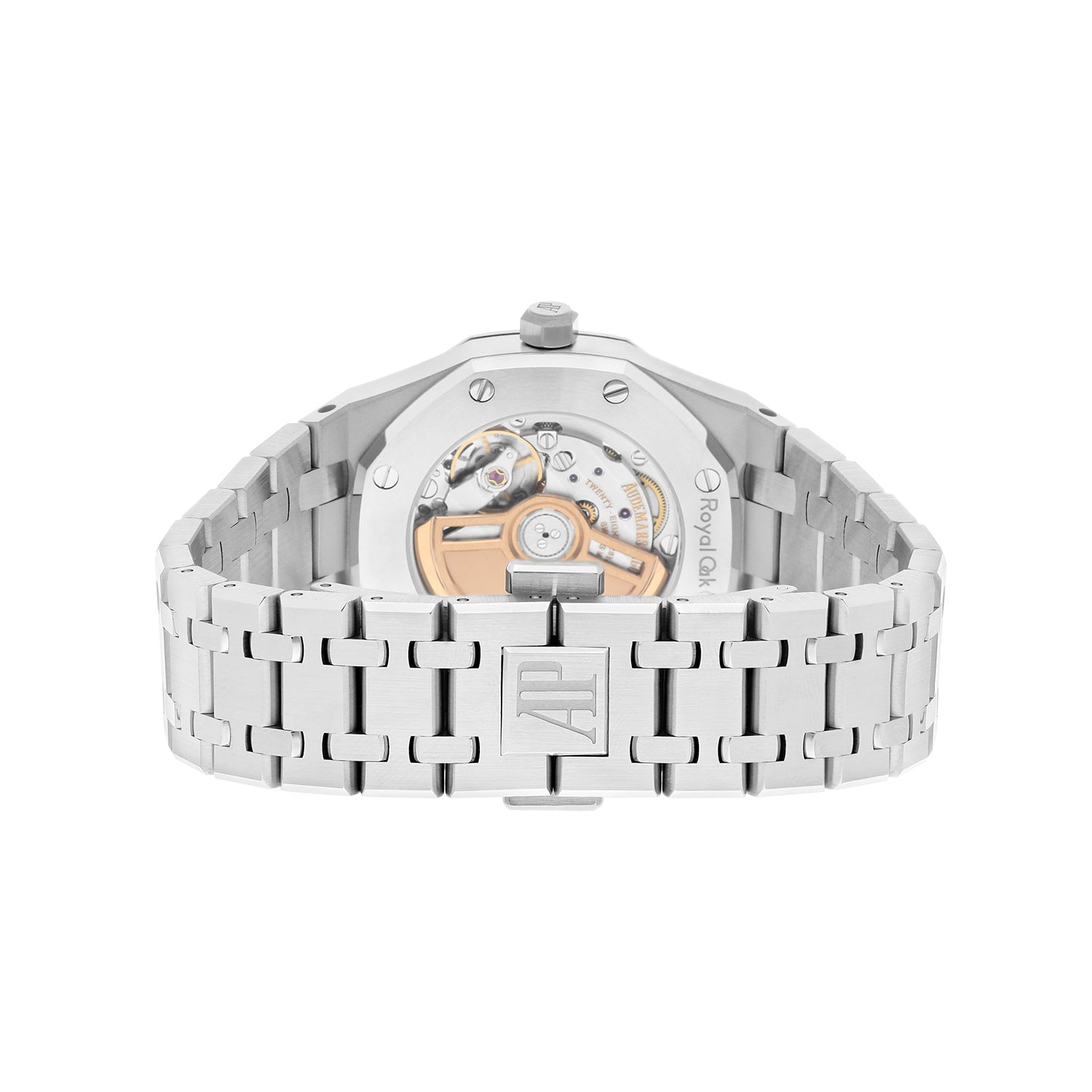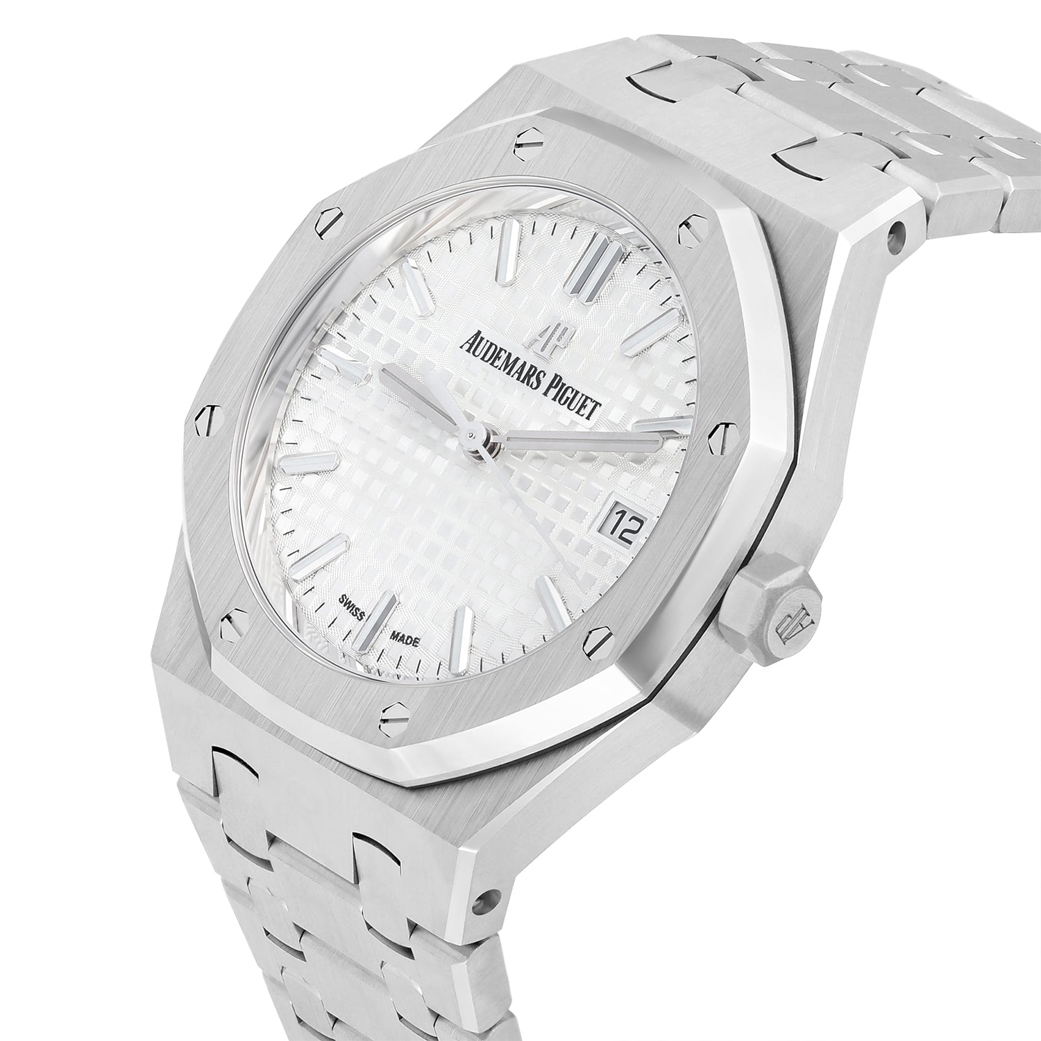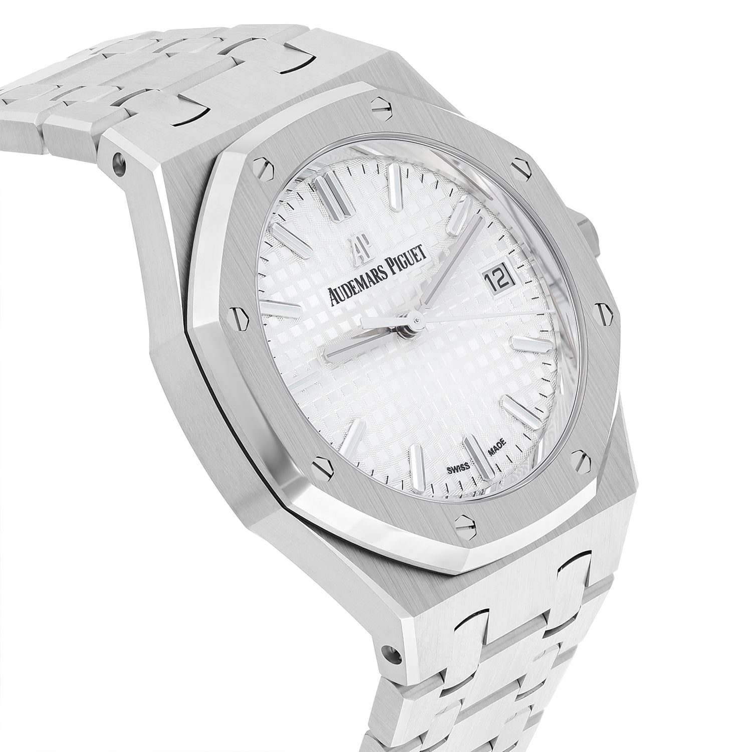 Stainless steel case with a silver-tone stainless steel bracelet. Fixed silver-tone stainless steel bezel. Silver-tone dial with index hour markers. Dial Type: Analog. Date display at the 3 o'clock position. Audemars Piguet Calibre 5800 Automatic movement, containing 28 Jewels, composed of 189 parts, bitting at 28800 vph, and has a power reserve of approximately 50 hours. Scratch resistant sapphire crystal.