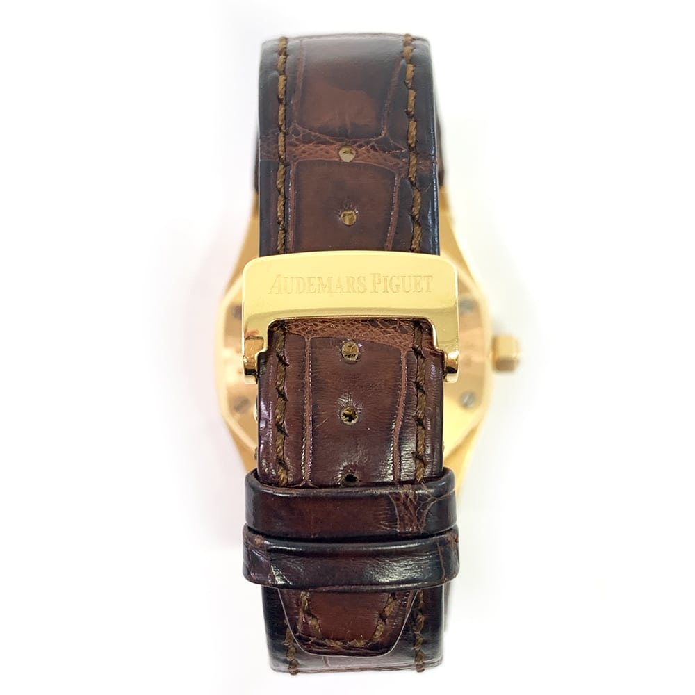 Date display at the 3 o'clock position. Audemars Piguet Calibre 3120 Automatic movement, containing 40 Jewels, composed of 280 parts, bitting at 21600 vph, and has a power reserve of approximately 60 hours. Scratch resistant sapphire crystal. Screw down crown. Sapphire crystal case back. Octagon case shape, case size: 39 mm, case thickness: 10.0 mm. 18k rose gold skeletonized ap fold over clasp. Water resistant at 50 meters / 165 feet. Functions: date, hour, minute, second. Luxury watch style.