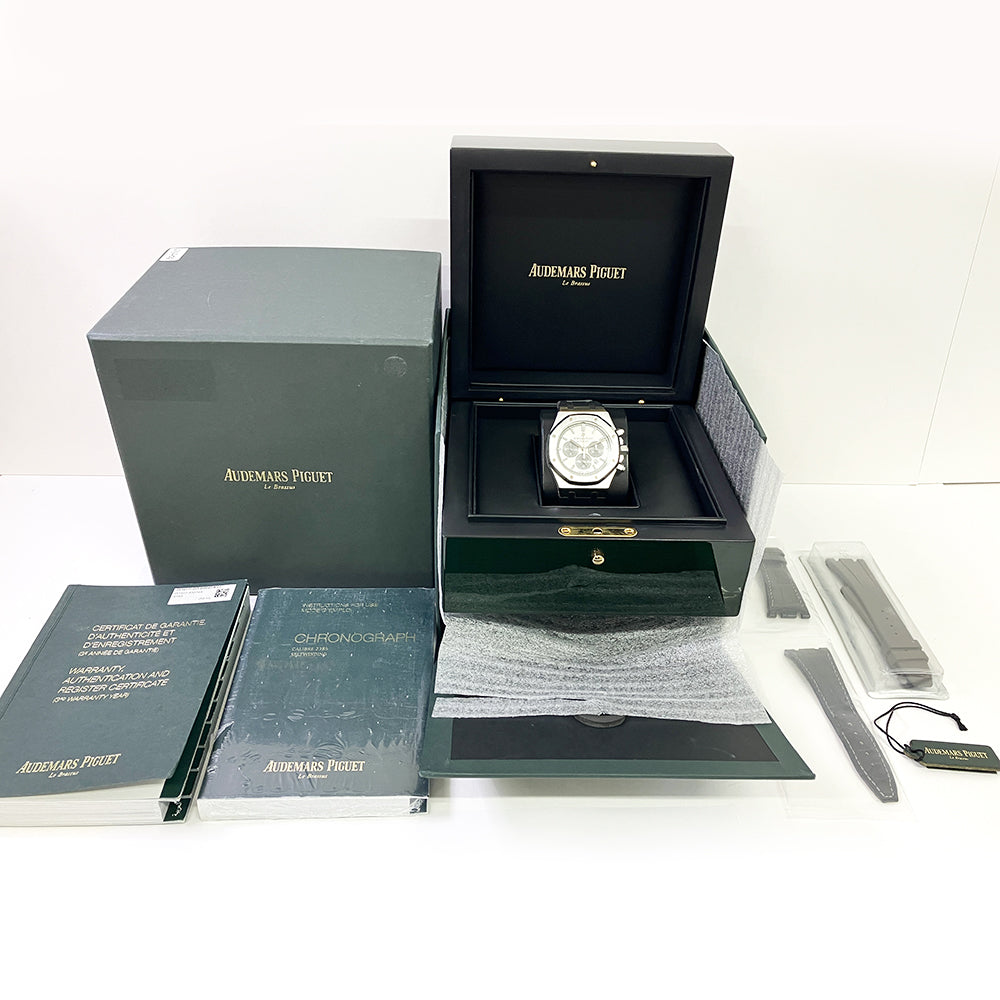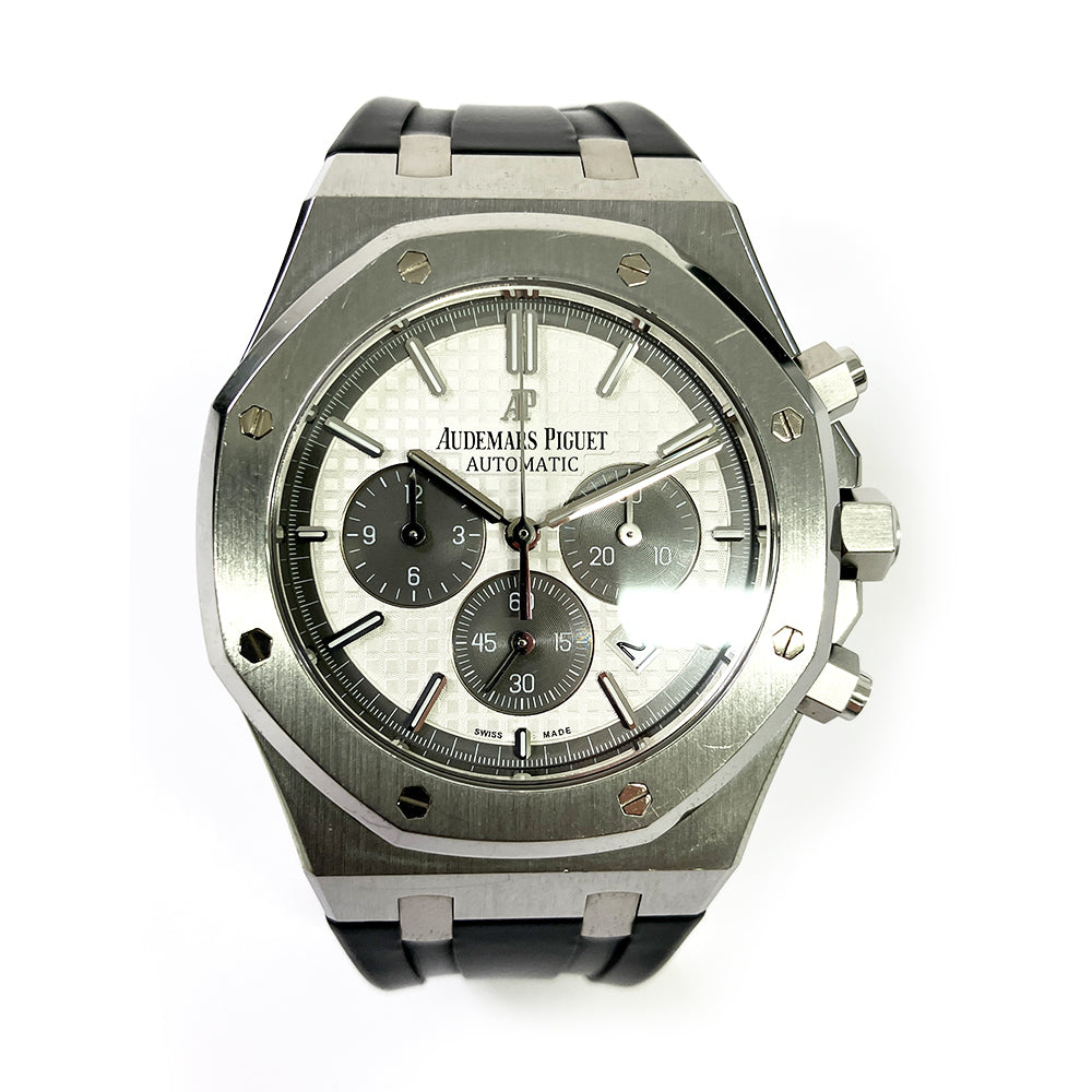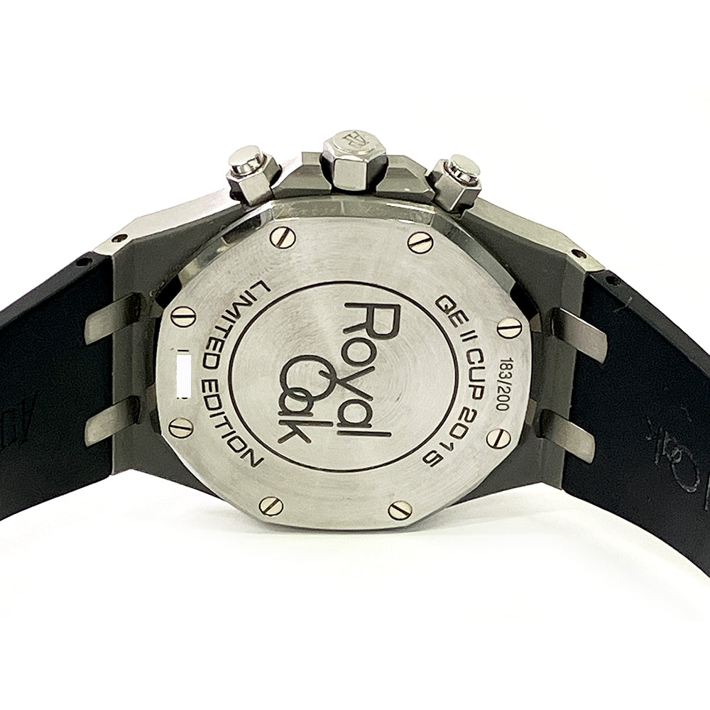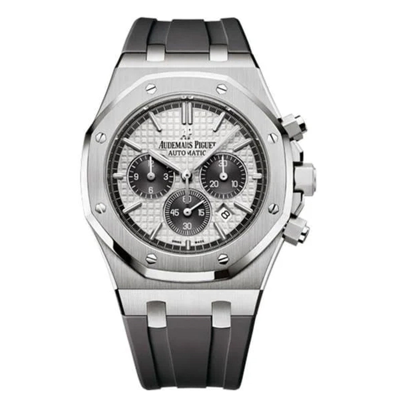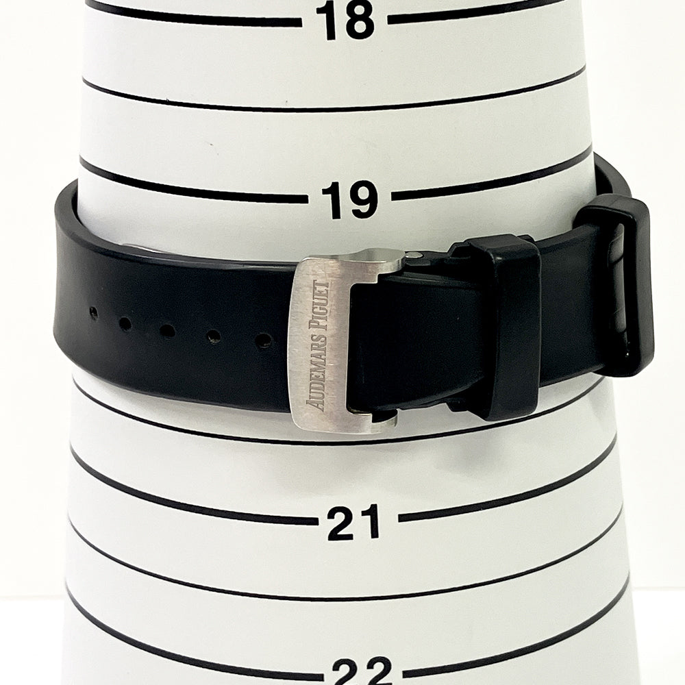 Grey titanium case with a blackrubber strap. 8 screws fixed grey bezel. Silver dial with silver-tone hands and index hour markers. Minute markers around the outer rim. Dial Type: Analog. Luminescent hands and markers. Date display between 4 and 5 o'clock position. Chronograph - three sub-dials displaying: 60 second, 30 minute and 12 hours. Audemars Piguet Calibre 2385 Automatic movement, containing 37 Jewels, composed of 304 parts, bitting at 21600 vph, and has a power reserve of approximately 40 hours.