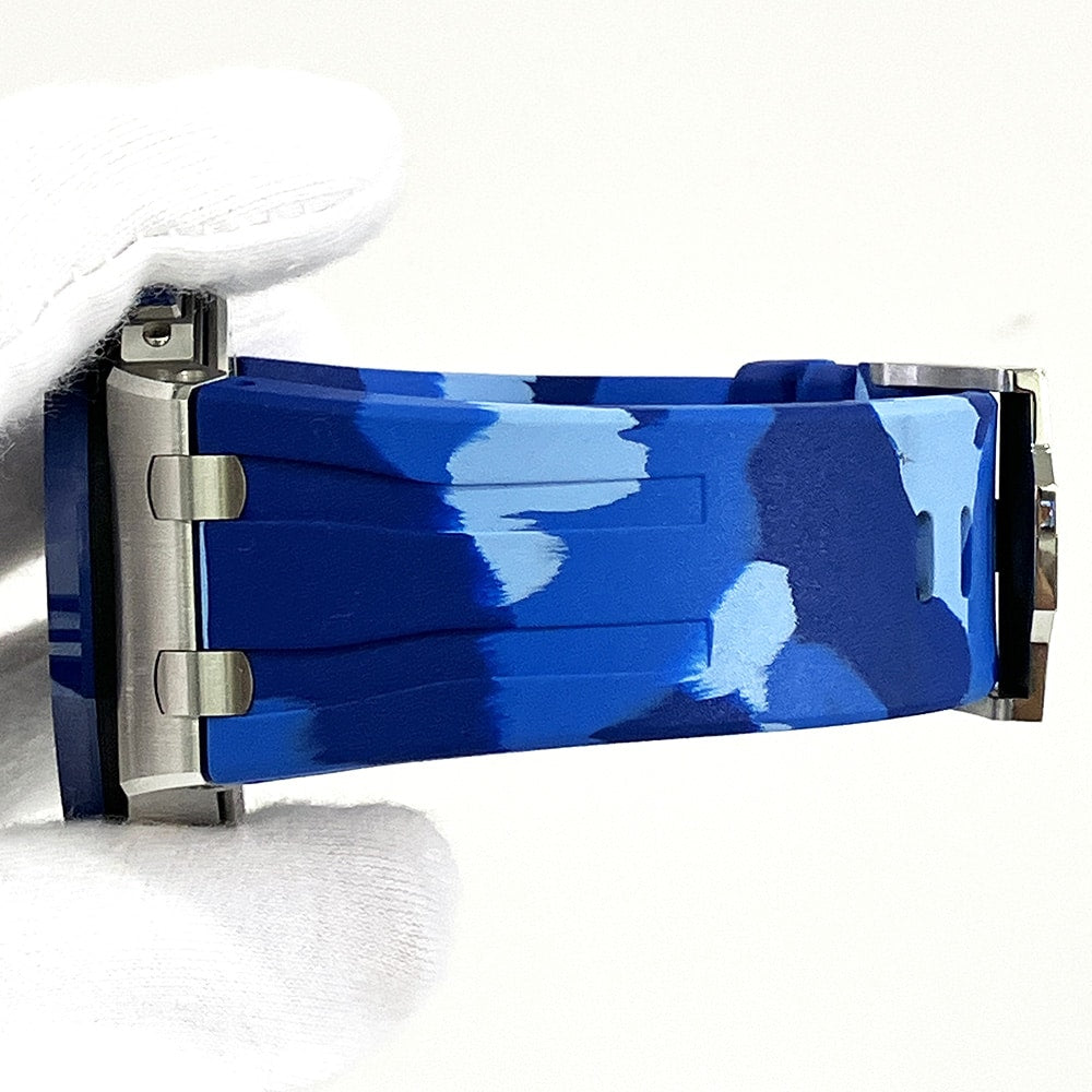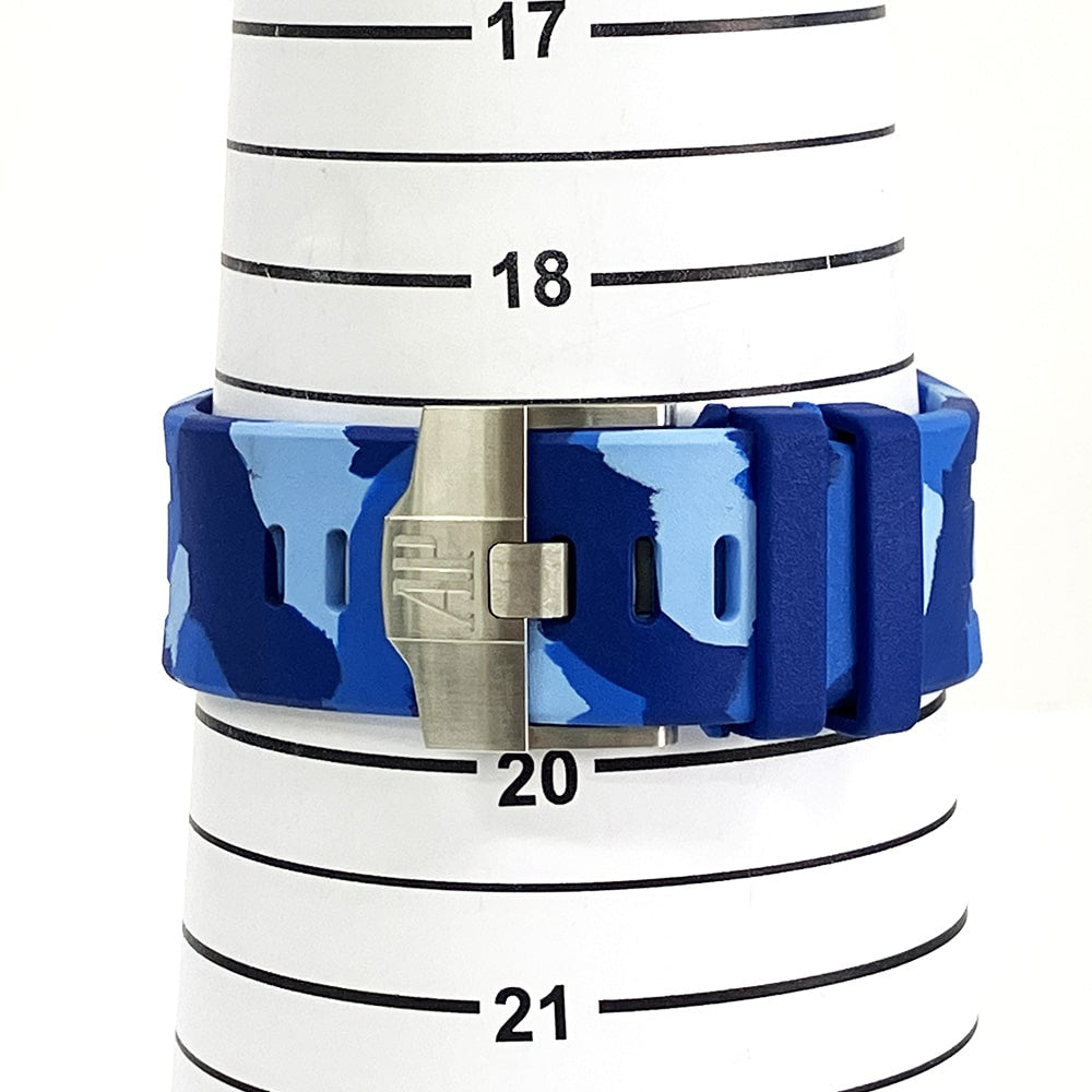 The Audemars Piguet Royal Oak Offshore Chronograph 26400SO.OO.A335CA.01, 44mm steel case paired with a ceramic bezel, offering both durability and a modern aesthetic. Blue dial with luminescent silver-tone hands and luminescent silver-tone index hour markers, protected by a scratch-resistant sapphire crystal. Powered by an automatic movement with a 50-hour power reserve, this chronograph showcases precision and functionality. Include a chronograph and date display. With a water resistance of 10 ATM (100 meters). Blue rubber strap, secured with a steel buckle clasp. Luxury watch style. Watch label: Swiss Made