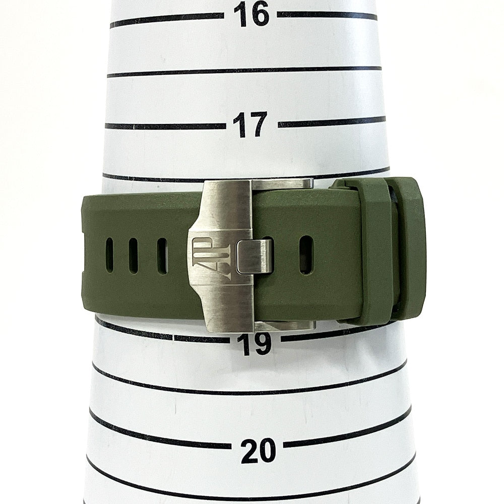 Protected by scratch resistant sapphire crystal, powered by the Audemars Piguet Caliber 4308. Offering a reliable 60-hour power reserve, incorporates 32 jewels. Water resistant up to 30ATM. Dive watch style. Watch label: Swiss Made.