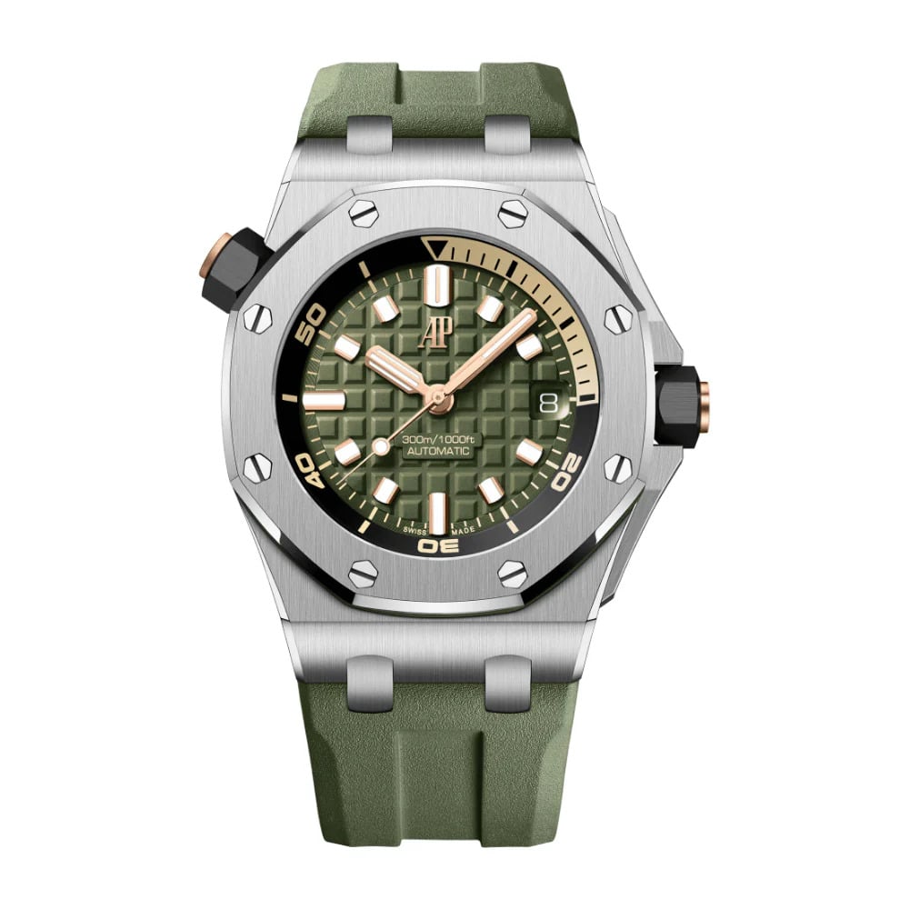 The Audemars Piguet Royal Oak Offshore Diver 15720ST.OO.A052CA.01 42mm stainless steel case with stainless steel bezel. Green dial with luminescent silver-tone hands and luminescent silver-tone Index hour markers. Green rubber strap with stainless steel buckle.