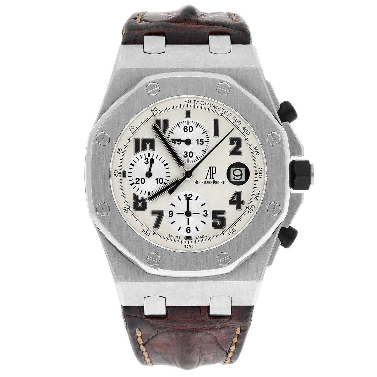 The ivory-white toned dial showcases a captivating "Méga Tapisserie" pattern, complemented by luminous hands and hour markers, ensuring optimal legibility in any lighting condition. Powered by a self-winding mechanical movement, this chronograph watch offers precise timekeeping and features a 12-hour, 30-minute, and small seconds subdial for enhanced functionality. The date display positioned at 3 o'clock adds practicality to its sophisticated design. The "Safari" edition embraces a unique color palette, with its brown alligator leather strap effortlessly harmonizing with the stainless steel case. The strap not only enhances the watch's vintage exploration aesthetic but also ensures a comfortable and secure fit on the wrist. The Audemars Piguet Royal Oak Offshore Chronograph Stainless Steel "Safari" ref. 26020ST.OO.D091CR.01 reflects the brand's dedication to crafting exceptional timepieces that seamlessly blend style and performance. With its distinctive design elements and reliable functionality, this watch would be a great addition to any watch collection.