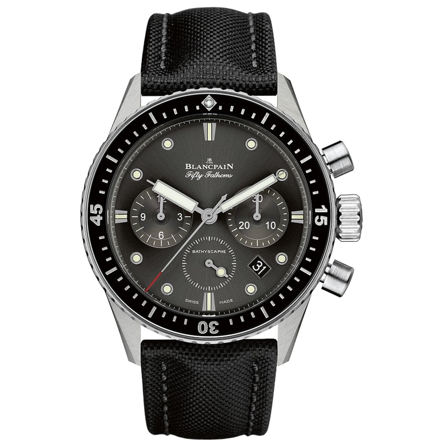 Stainless steel case with a black sail canvas bracelet. Uni-directional rotating bezel. Luminous hands and dot hour markers. Minute markers around the outer rim. Date display between 4 and 5 o'clock position. Chronograph - sub-dials displaying: three - 60 second, 30 minute and 12 hour. Blancpain caliber F385 automatic movement with about 50 hours of power reserve. Scratch resistant sapphire crystal. Case size: 43 mm. Case thickness: 14.85 mm. Round case shape. Water resistant at 300 meters / 1000 feet. Functions: chronograph, column wheel, fly back, date, hour, minute, small second. Luxury watch style.