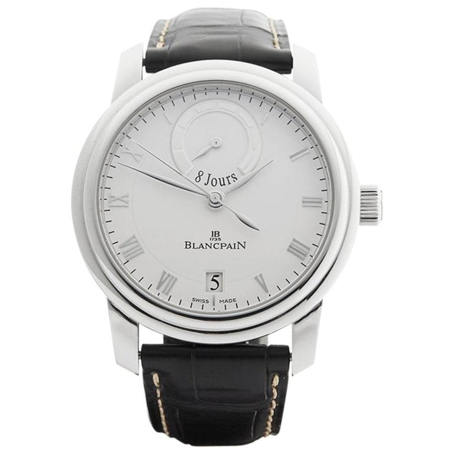 Calibre 13R0 with 8-day power reserve, 28,800 vibrations/hour (4 Hz). This 260-piece limited edition Blancpain Le Brassus "8 Jours" 4213-3442-55B is housed in 42-mm platinum case with transparent caseback, and black crocodile leather strap with platinum folding clasp. An anti-reflective sapphire crystal protects the silver dial with Roman numeral markers, power reserve indicator and date display at 6 o'clock position of this Blancpain Le Brassus 8 Day Power Reserve 4213-3442-55B. This efficient timepiece is water resistant to 50 meters (165 feet) which is suitable for swimming and shallow snorkeling but not for diving.