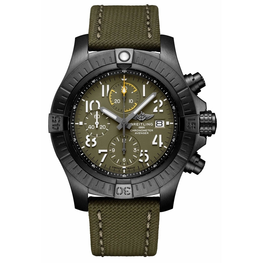 Breitling Avenger Chronogragh Night Mission V13317101L1X1 Black Titanium with Khaki Green Leather Watch 2024