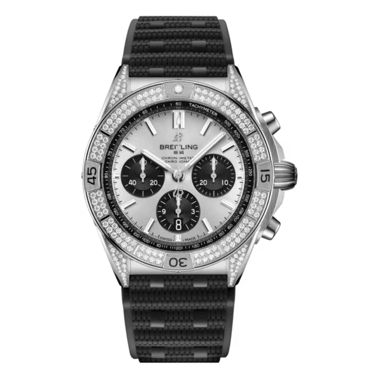 The Breitling Chronomat B01 AB0134721G1S2 is a dynamic fusion of technical performance and luxury, featuring a 42mm stainless steel case with gem-set accents for a refined, sporty look. It is powered by the Breitling 01 manufacture movement, a self-winding mechanical caliber with an impressive 70-hour power reserve. The chronograph offers 1/4th second precision, along with 30-minute and 12-hour totalizers, and is protected by a screw-locked crown, sapphire crystal caseback, and unidirectional ratcheted bezel.