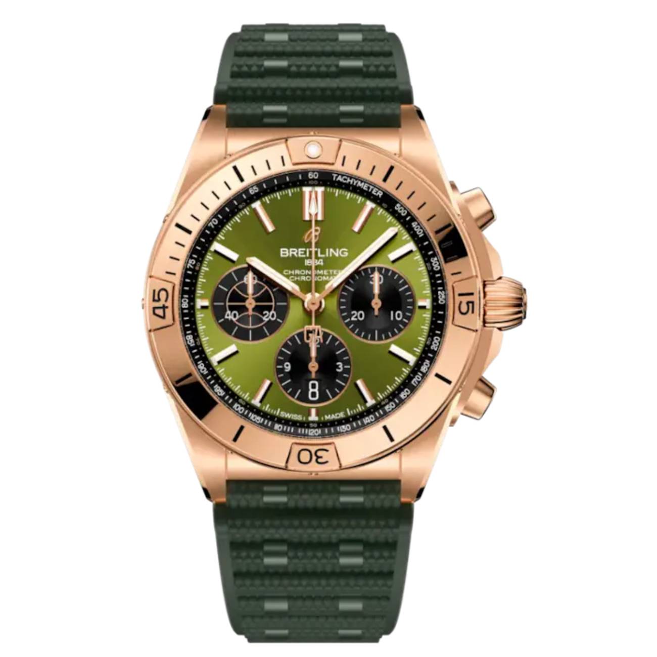 Breitling Chronomat B01 RB01344A1L1S1 42mm Green Dial Unidirectional Ratcheted Rotating Bezel 18k Red Gold With Green Rubber Strap Watch
