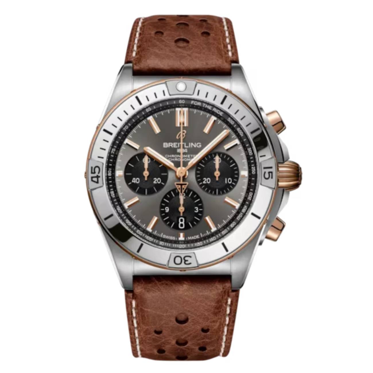 Breitling Chronomat B01 Triumph TB0134101M1X1 42mm Grey Dial Unidirectional, Ratcheted Bezel Titanium & 18K Red Gold with Brown Calfskin Leather Watch