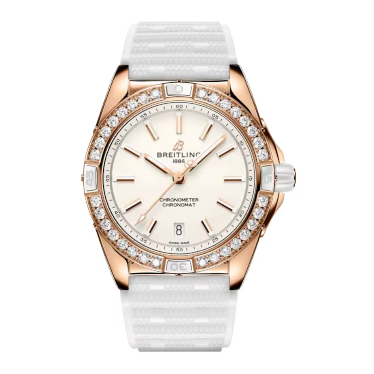 Breitling Chronomat R17356531G1S1 38mm White Dial Unidirectional Rotating Bezel 18k Red Gold (Gem Set) with White Rubber Strap Watch