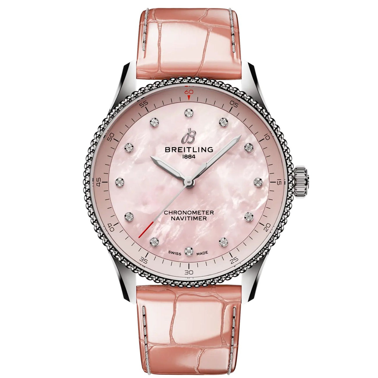 Breitling Navitimer 32mm A77320D91K1P1 Stainless Steel with Pink Alligator Leather Watch Pink MOP Diamond Dial 2024