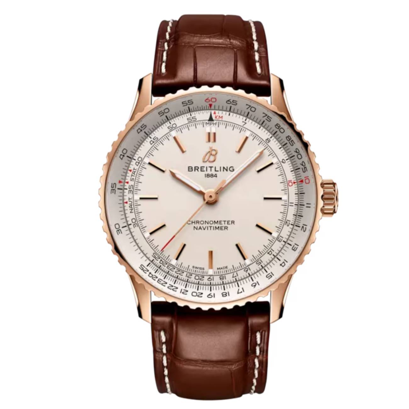 Elegantly fitted with a brown alligator leather strap and a matching 18K red gold tang buckle, this Navitimer embodies understated luxury. Its clean, no-chronograph design enhances daily wearability while retaining iconic aviation elements. With a screwed-in caseback, 3-bar water resistance, and a balanced 11.65mm thickness, it's a sophisticated companion for those who appreciate heritage watchmaking and distinctive aesthetics.