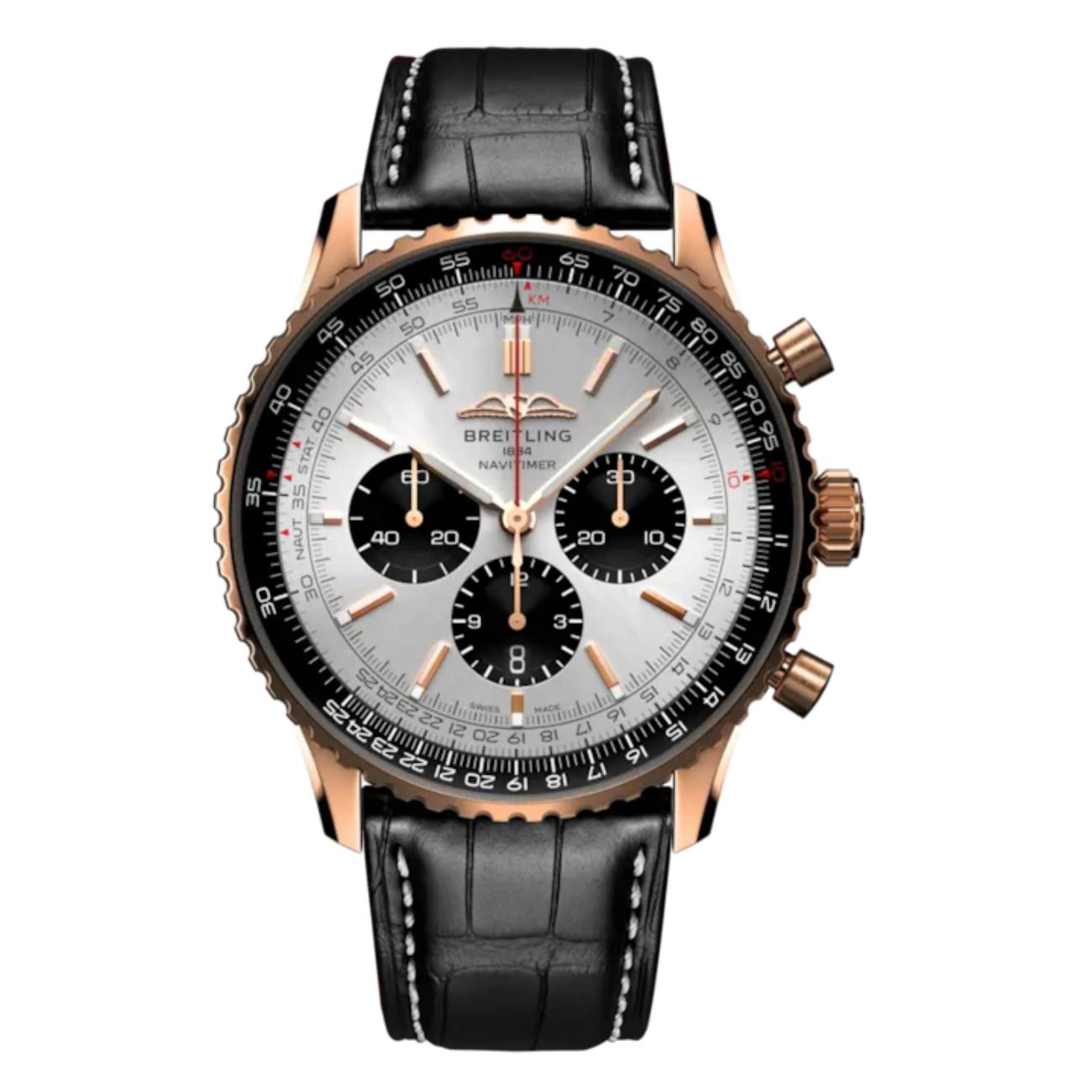 Breitling Navitimer B01 Chronograph RB0137241G1P1 46mm Silver Dial Bidirectional Rotating Bezel 18k Red Gold with Black Alligator Leather Strap Watch