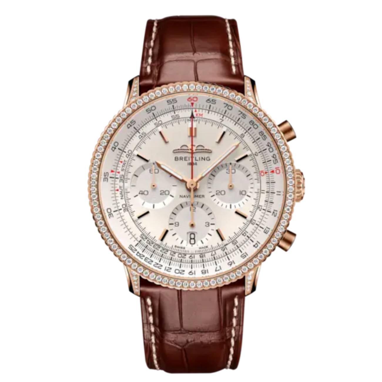 Breitling Navitimer B01 Chronograph RB0139631G1P1 41mm White Dial Fixed Bezel 18k Red Gold (Gem-set) with Brown Alligator Leather Strap Watch
