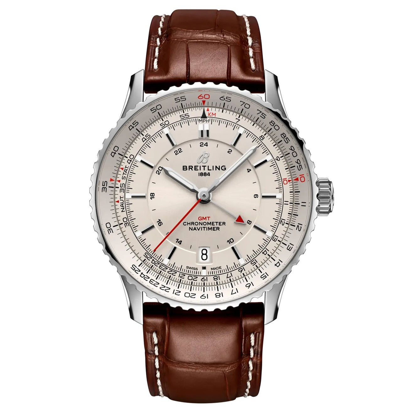 Breitling Navitimer GMT 41 Silver Dial A32310211G1P1 Stainless Steel with Brown Leather Watch 2024
