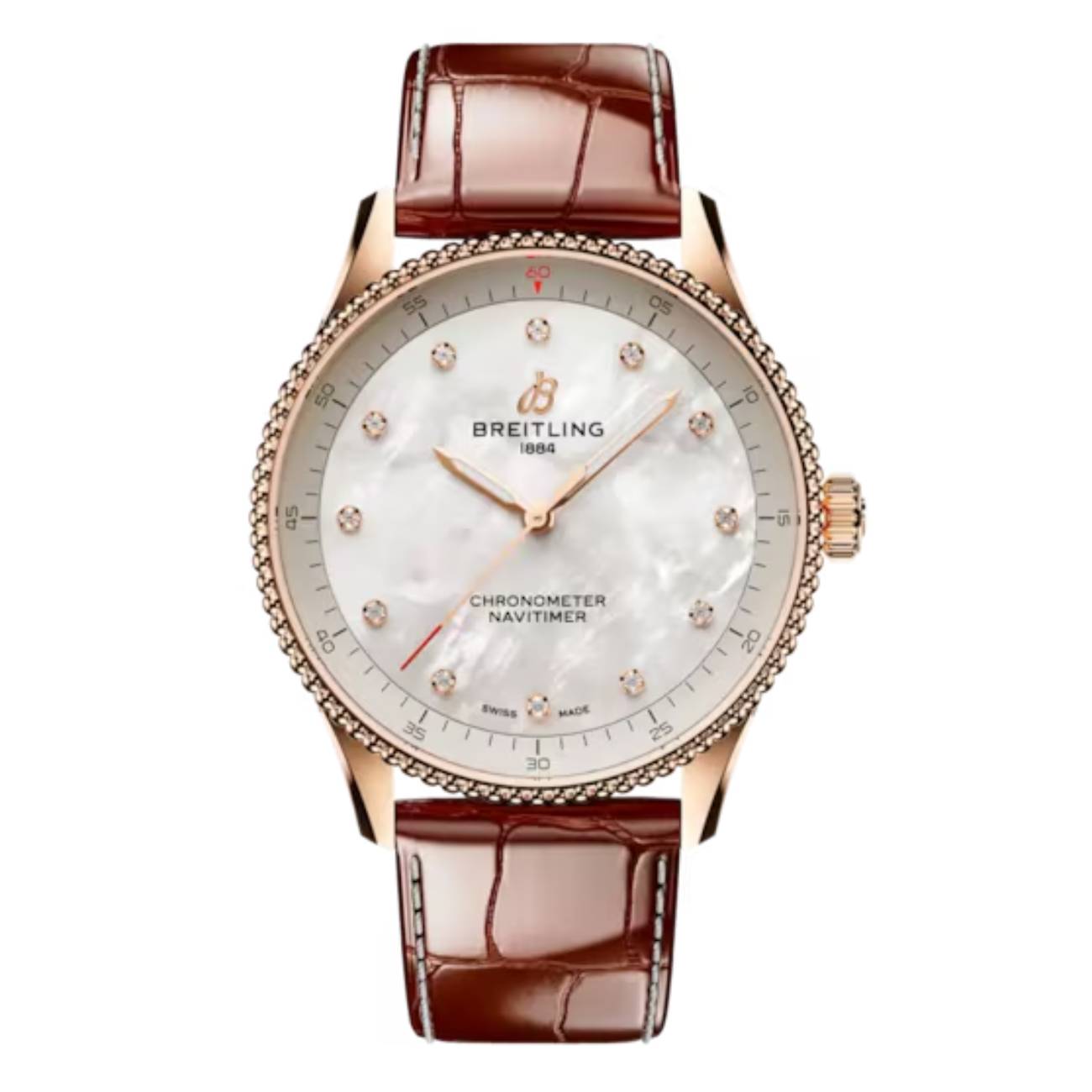 This model features a rich brown alligator leather strap with a matching 18K red gold tang-type buckle, ensuring a secure and luxurious fit. The fixed bezel, non-screw-locked crown with two gaskets, and light overall weight of just 42 grams add to the comfort and refinement. Designed for women who appreciate timeless style and reliable performance, the Navitimer Automatic is a modern classic in Breitling's iconic aviation-inspired collection.
