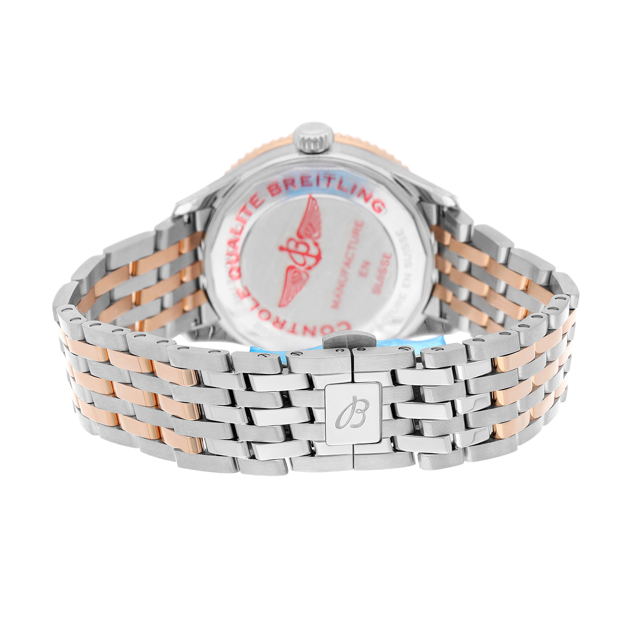 The Breitling Navitimer Automatic 36 (ref. U17327211A1U1) features a 36mm stainless steel case with 18k red gold accents and a bidirectional slide rule bezel. Powered by the Breitling 17 self-winding movement with approximately 38 hours of power reserve, it offers precise timekeeping at 28,800 vibrations per hour.