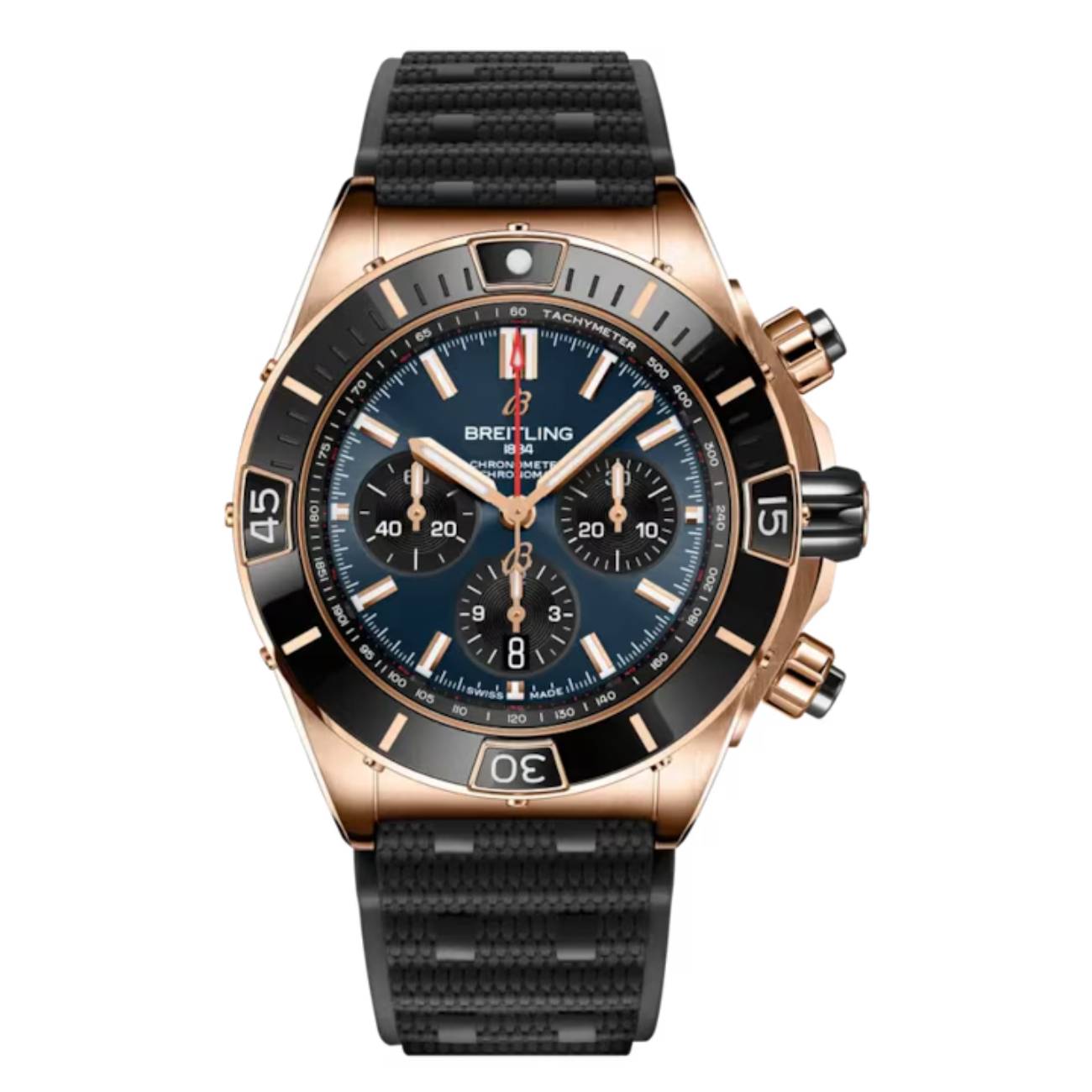 Measuring 44mm in diameter and 14.45mm thick, the watch makes a bold statement on the wrist while remaining comfortable thanks to its durable black rubber strap and matching red gold folding clasp. With 200 meters of water resistance, a screw-locked crown, and sapphire caseback, the Super Chronomat B01 blends sporty functionality with high-end materials—perfect for those who demand both elegance and endurance.