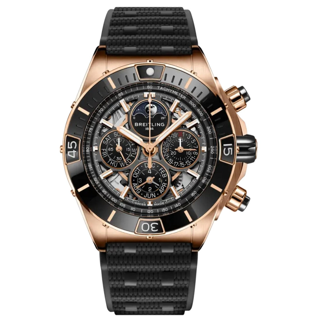Breitling Super Chronomat B19 RB19301A1G1S1 44mm Skeleton Dial Unidirectional Ratcheted Rotating Bezel 18k Red Gold With Black Rubber Strap Watch