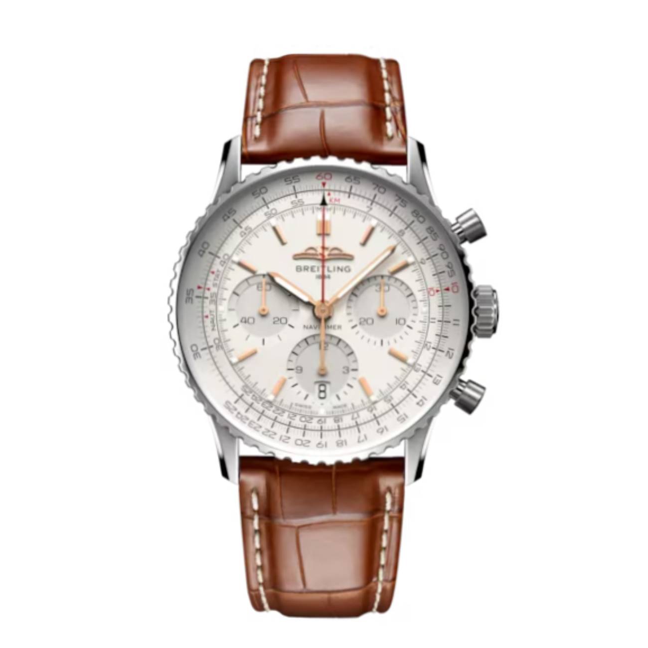 Breitling Super Navitimer B01 Chronograph AB0139211G1P1 41mm White Dial Bidirectional Rotating Bezel Stainless Steel with Gold Brown Alligator Leather Strap Watch