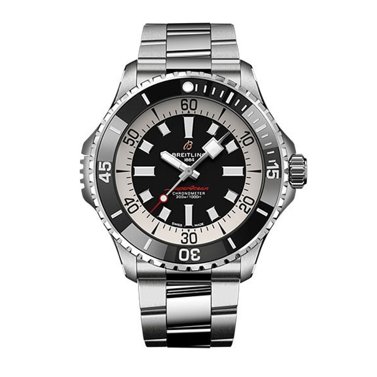 46.0 mm stainless steel case, 13.2 mm thick, screw-locked crown with two gaskets, bidirectional ratcheted bezel, cambered sapphire crystal with glareproof treatment on both sides, black dial, Breitling 17 self-winding movement, approximately 38 hrs of power reserve, stainless steel bracelet. Water resistant to 300 m (1,000 ft).
