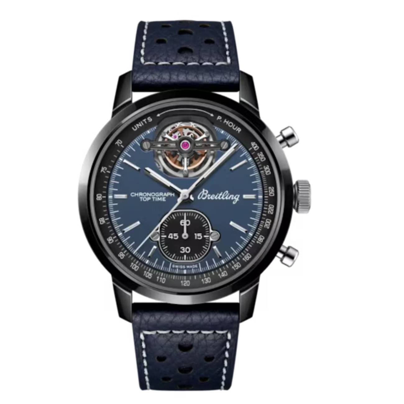 The Breitling Top Time B21 SB21251A1C1X1 is a striking chronograph that blends technical performance with modern design. Powered by the Breitling B21 movement—crafted in partnership with La Joux-Perret—this self-winding mechanical timepiece features a 1/4th second chronograph with a 60-minute counter and delivers a power reserve of approximately 55 hours. Its high-frequency movement beats at 28,800 v.p.h. and is supported by 30 jewels for enhanced precision.