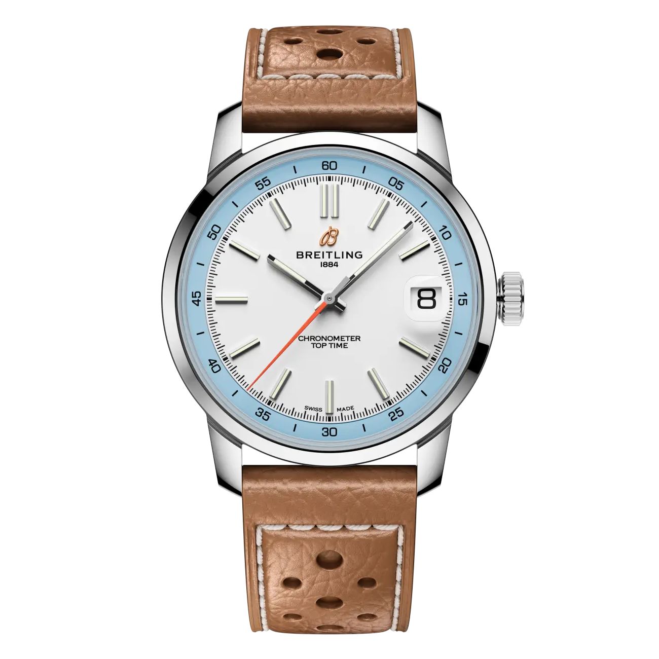 Breitling Top Time B31 AB3113281A1X1 38mm Automatic White and Sky-blue Dial Fixed Bezel Stainless Steel in Beige Calfskin Leather Strap Watch