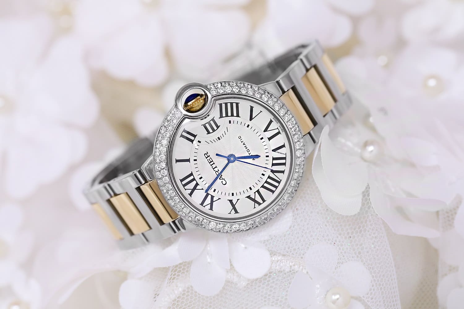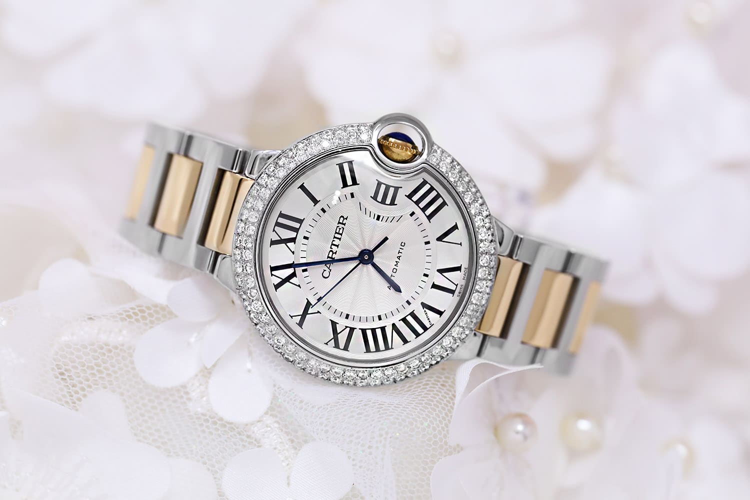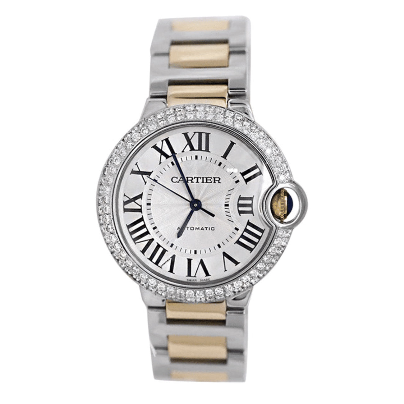 Cartier Ballon Bleu 36mm Steel 18K Yellow Gold Silver Dial Two Tone Unisex Watch Custom Diamond Bezel W6920047