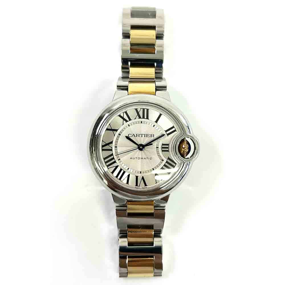 Cartier Ballon Bleu 33mm Women's Watch Model W6920099. Stainless Steel case with Steel and Yellow Gold Polished watch band. Hidden Folding Clasp clasp. fixed bezel. Silver dial. Automatic Self Winding movement. Scratch Resistant Sapphire crystal. Case size: 33mm. Case thickness: 9.96mm. Solid case back. 30 Meters /100 feet water resistant.