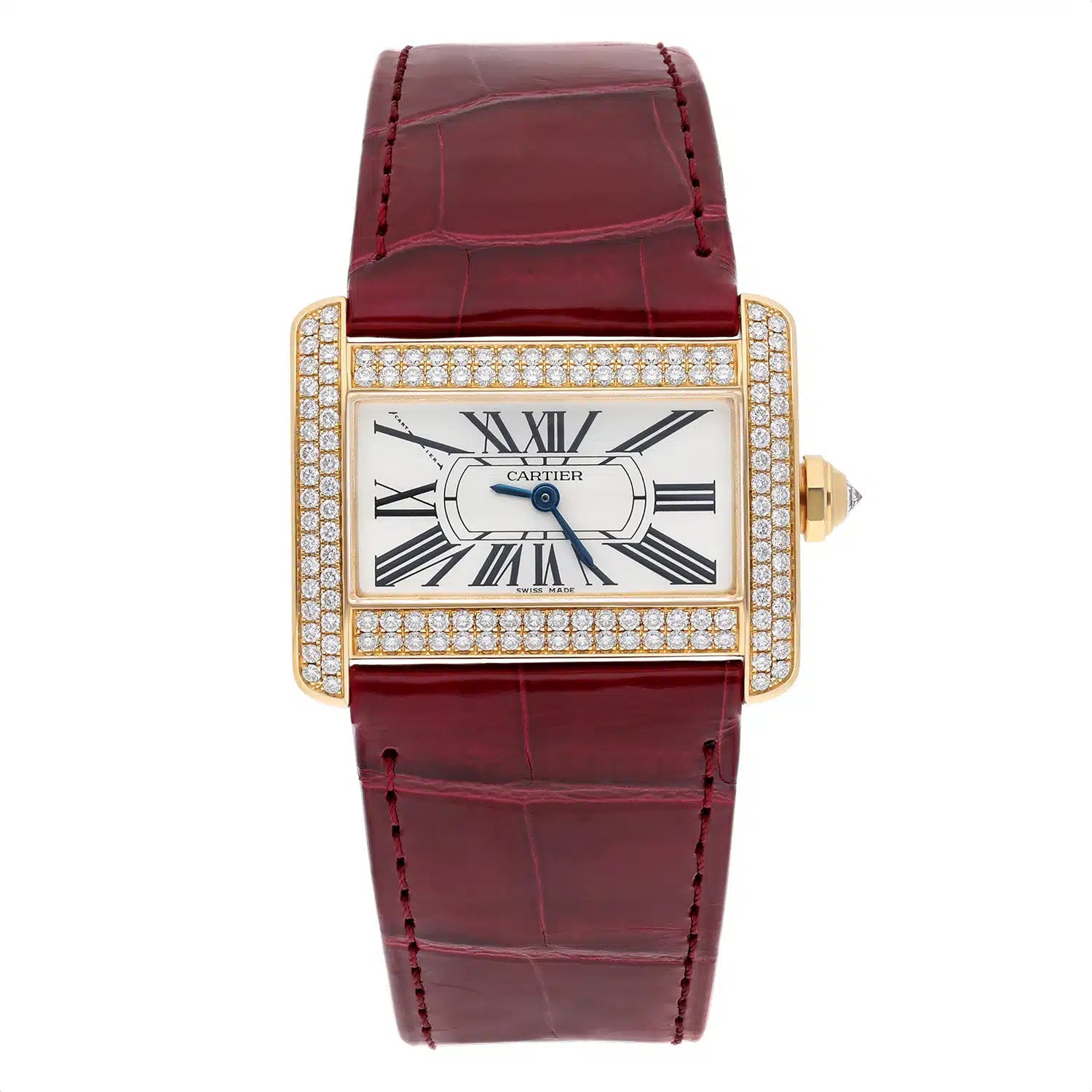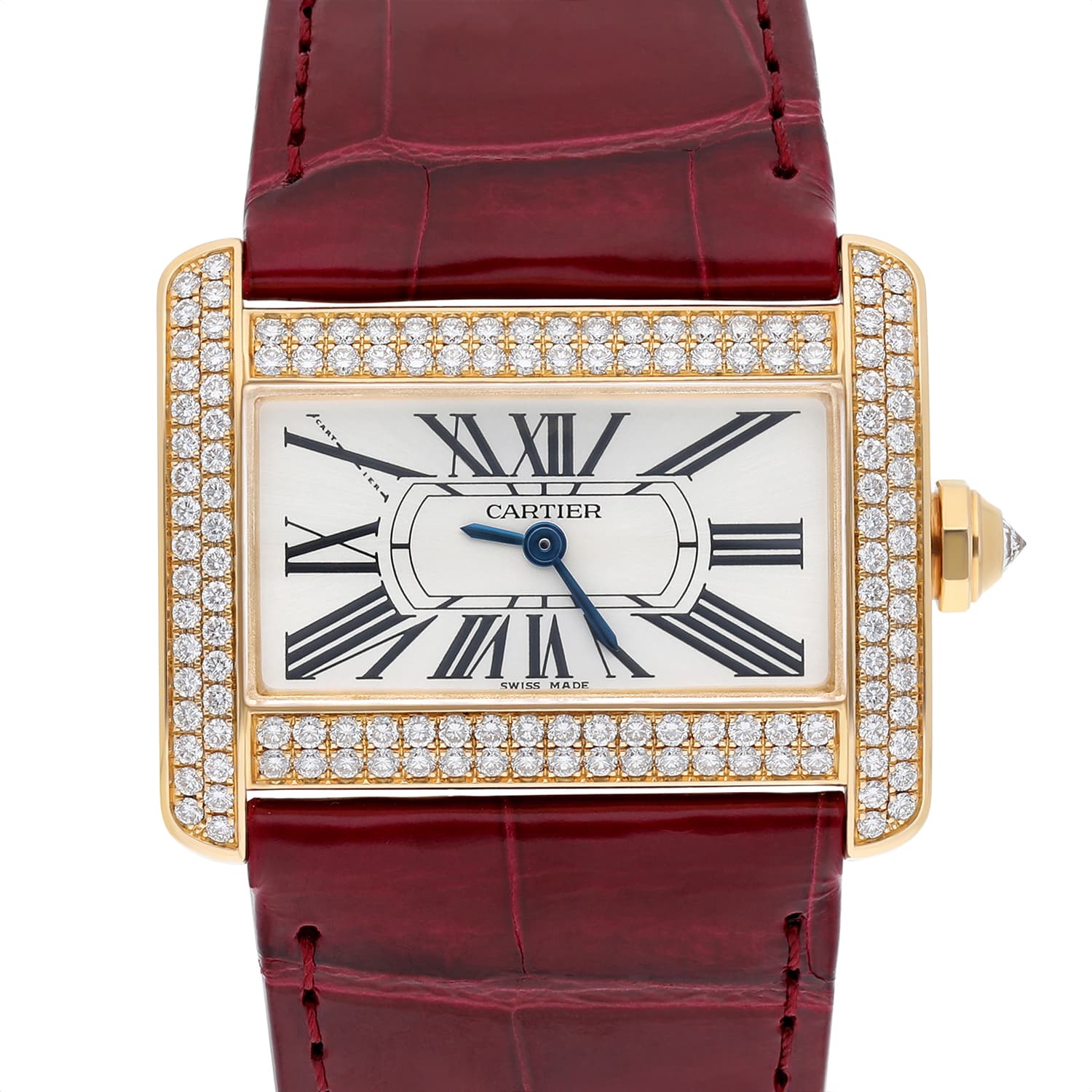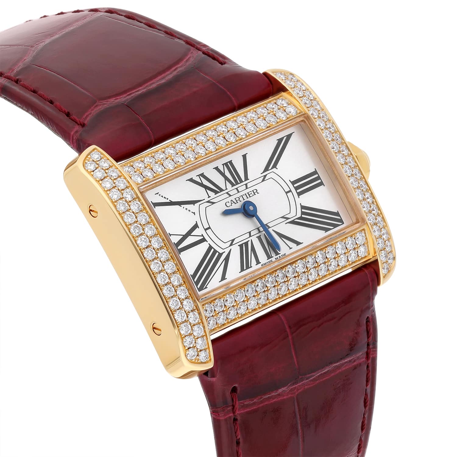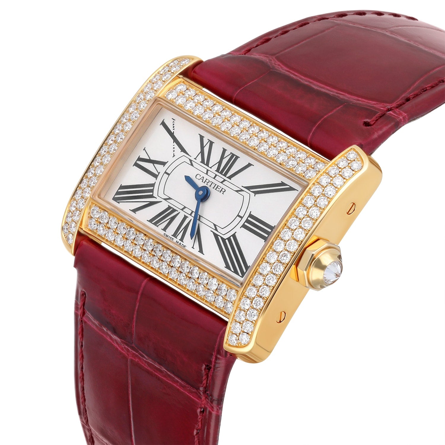 Elevate your style with this exquisite Cartier Tank Divan Mini wristwatch, crafted from yellow gold with a two-piece leather strap in a stunning red hue. The watch features roman numerals on a silver dial, with a factory diamond-encrusted bezel adding a touch of luxury. The Swiss-made timepiece boasts a quartz movement, sapphire crystal, and a 12-hour dial, making it perfect for both casual and formal occasions.