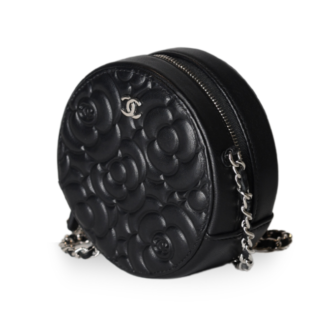 This Chanel Camellia Embossed Round Coin Purse is crafted from black lambskin leather with silver-tone hardware. It features an embossed camellia flower design and a classic CC logo on the front. The compact, round shape is ideal for storing coins, cards, or small essentials. The interior is lined and secured with a zip-around closure. Lightweight and portable, this piece is both functional and decorative, offering a refined accessory for everyday or occasional use.
