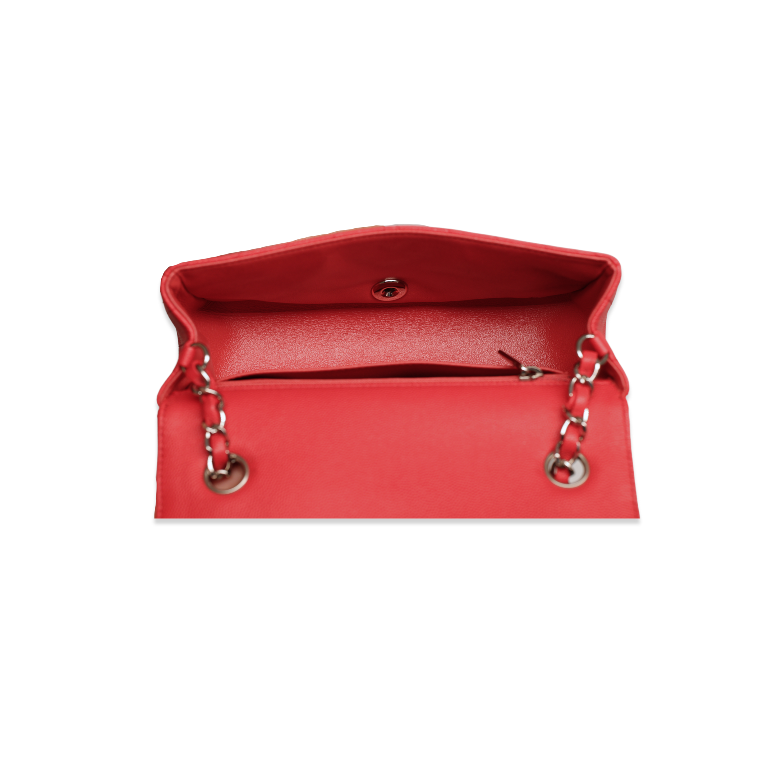 This Chanel Mini Rectangular Flap Bag is crafted from red caviar leather with chevron quilting and gold-tone hardware. It features a front flap with the classic interlocking CC turn-lock closure and a leather-threaded gold chain strap that can be worn over the shoulder or as a crossbody. The compact size is ideal for carrying essentials, while the structured design maintains its shape. The interior is lined and includes a small compartment for organization.