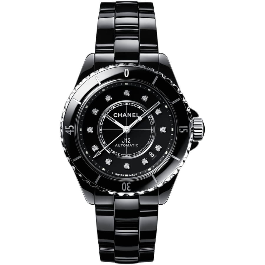 Black (highly resistant) ceramic case and bracelet. Bi-directional rotating black (highly resistant) ceramic bezel with a steel rim. Black dial with silver-tone hands and diamond hour markers. Minute markers around the outer rim. Date display between 4 and 5 o'clock position. Chanel caliber 12.1 automatic movement. Scratch resistant sapphire crystal. Screw down crown. Transparent case back. Round case shape. Case size: 38 mm. Hidden fold over clasp. Water resistant at 200 meters / 660 feet. Functions: date, hour, minute, second. J12 Series. Dress watch style.