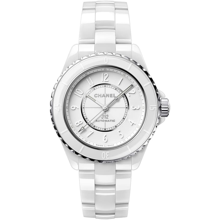 White ceramic case and bracelet. Uni-directional rotating stainless steel bezel. White dial with white hands and white Arabic numeral hour markers. Minute markers around the outer rim. Dial Type: Analog. Luminescent hands and markers. Kenissi/Chanel Calibre 12.1 Automatic movement, containing 28 Jewels, bitting at 28800 vph, and has a power reserve of approximately 70 hours. Scratch resistant sapphire crystal. Screw down crown. Round case shape, case size: 38 mm, case thickness: 12.6 mm. Fold over clasp. Water resistant at 200 meters / 660 feet. Functions: hour, minute, second,