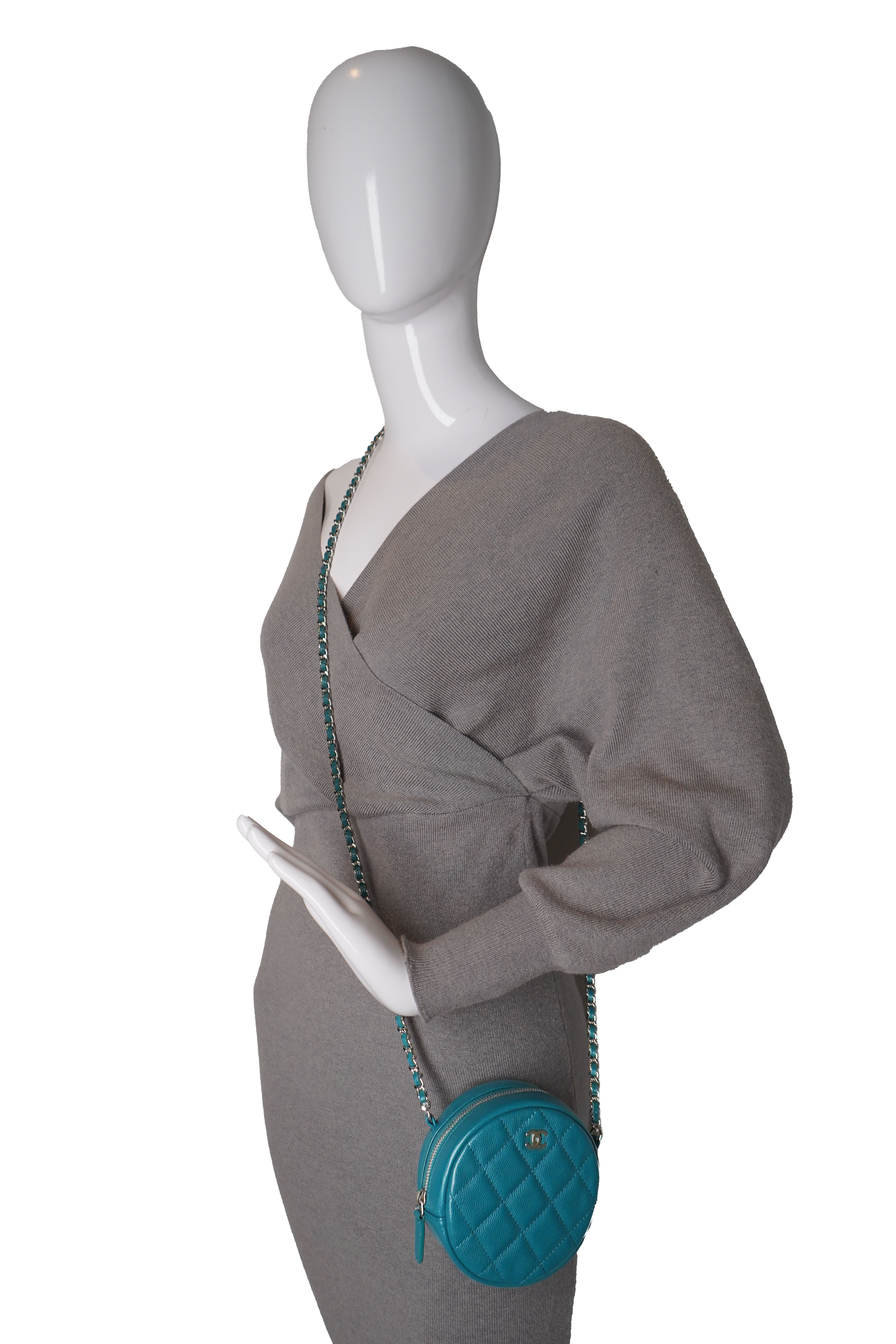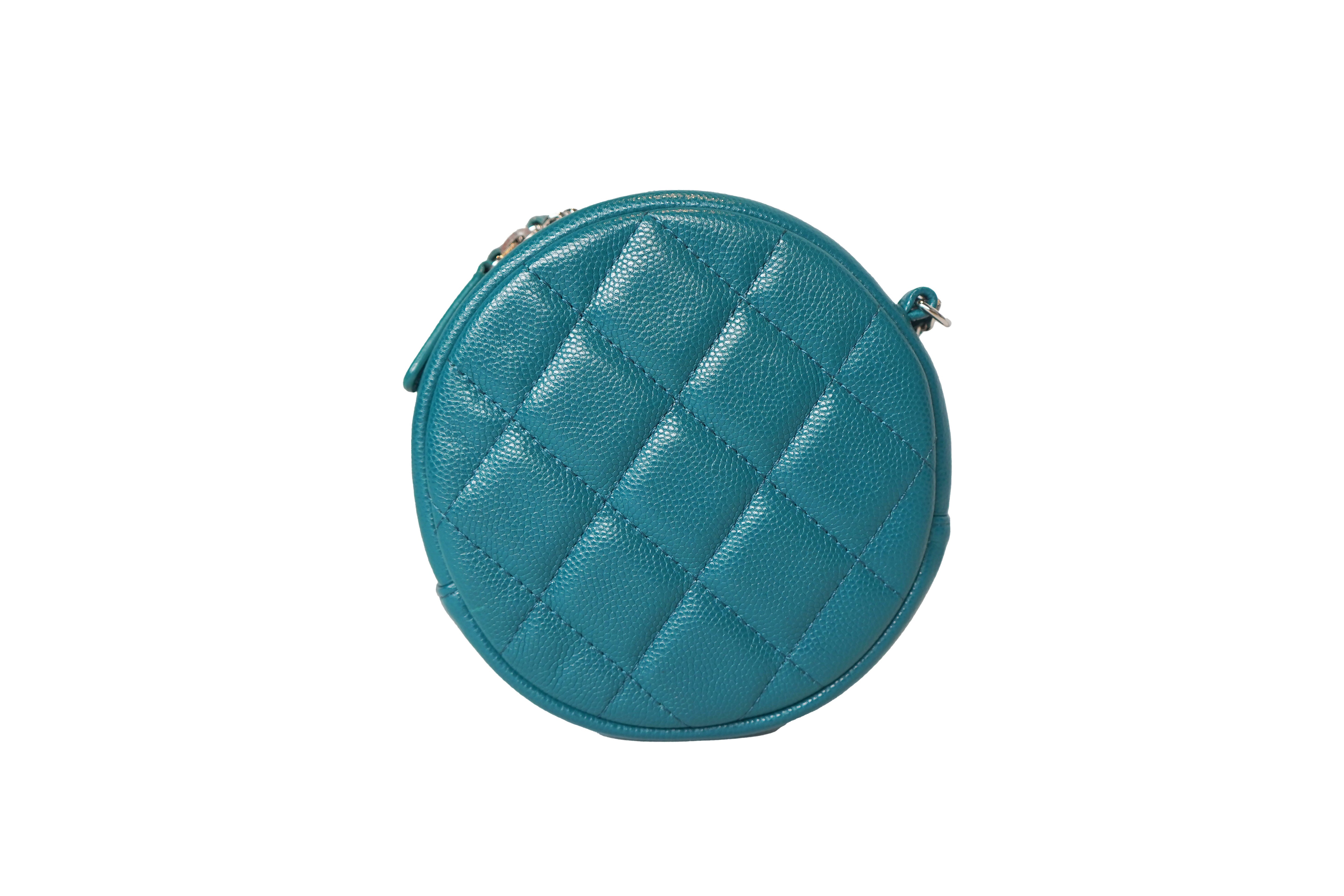 This Chanel Round Bag is crafted in durable teal caviar leather with signature diamond quilting and finished with gold-tone hardware. The front features the iconic CC logo, while the structured circular silhouette offers a playful yet elegant take on Chanel’s classic design. Designed with a leather-woven chain strap, it can be worn crossbody or on the shoulder, making it a versatile and stylish piece.