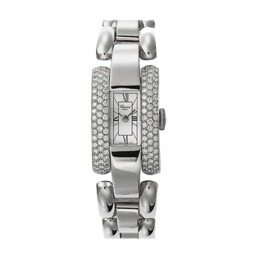 18kt white gold 18mm x 30mm case. 18k white gold bezel with diamonds. 18k white gold bracelet. 18k white gold lugs. White colored dial with Arabic numeral hour markers. Quartz movement. Hours and minutes. Waterproof up to 25 meters.