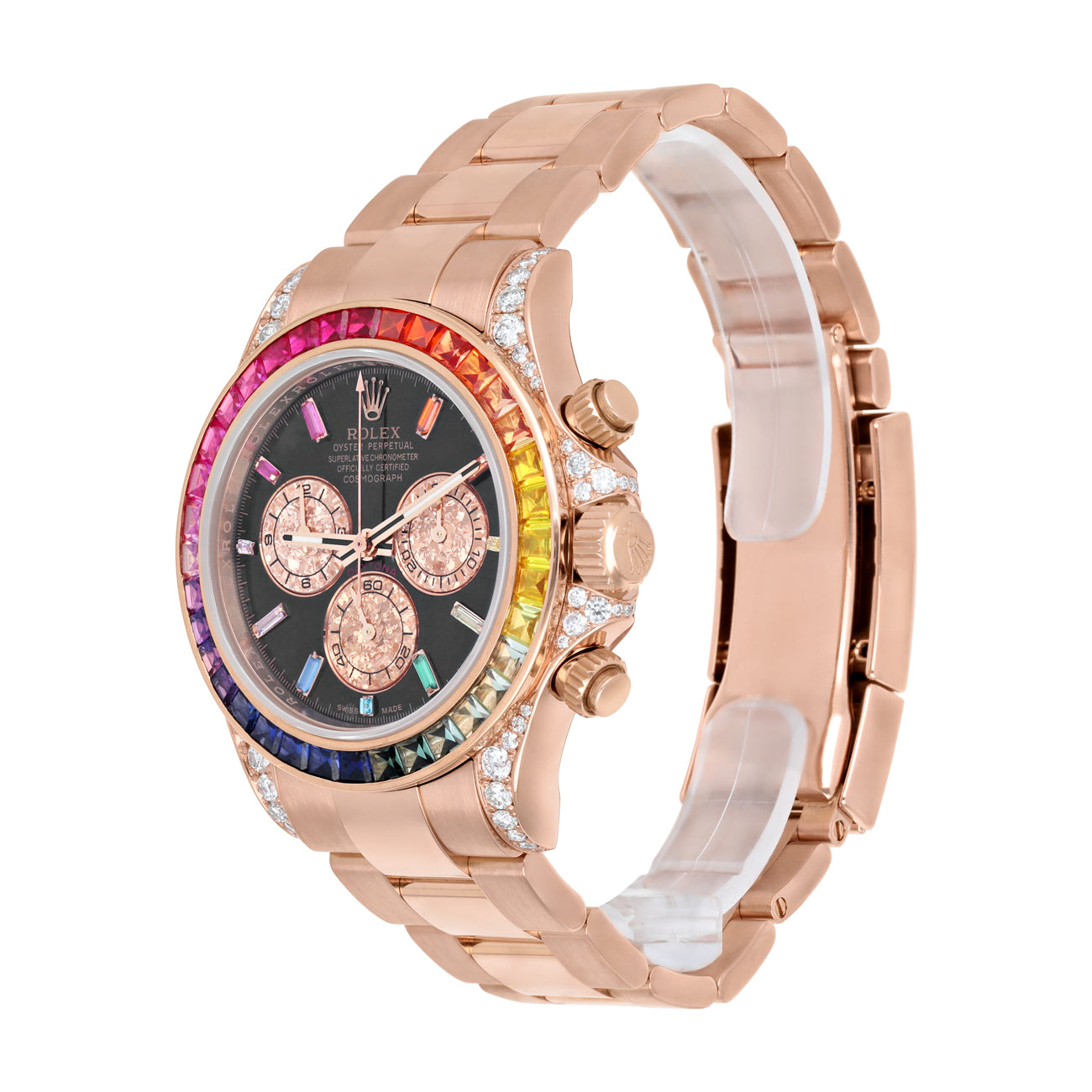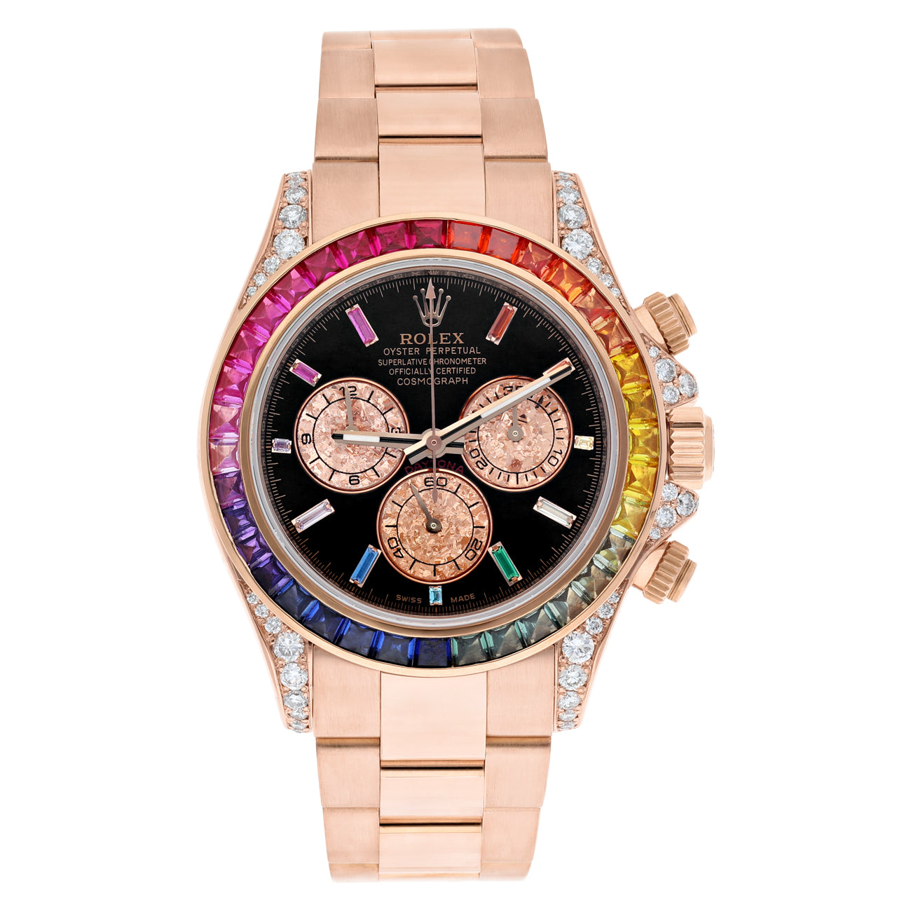 Custom Rolex Cosmograph Daytona 116505 Rainbow Bezel Diamond Lugs Black Dial 18K Rose Gold Watch