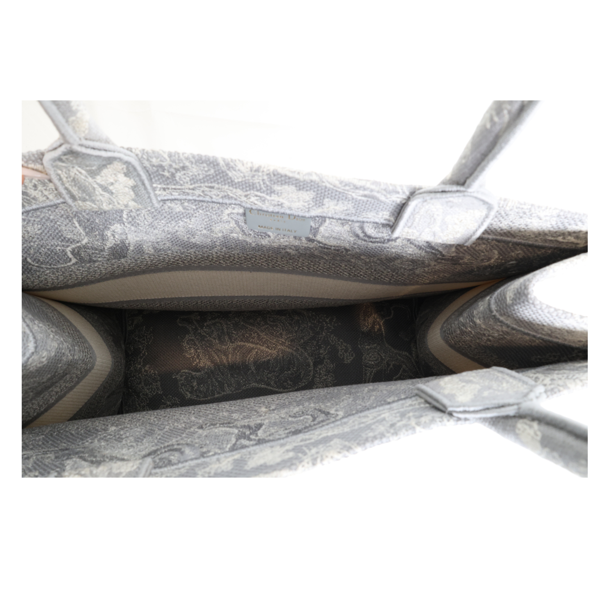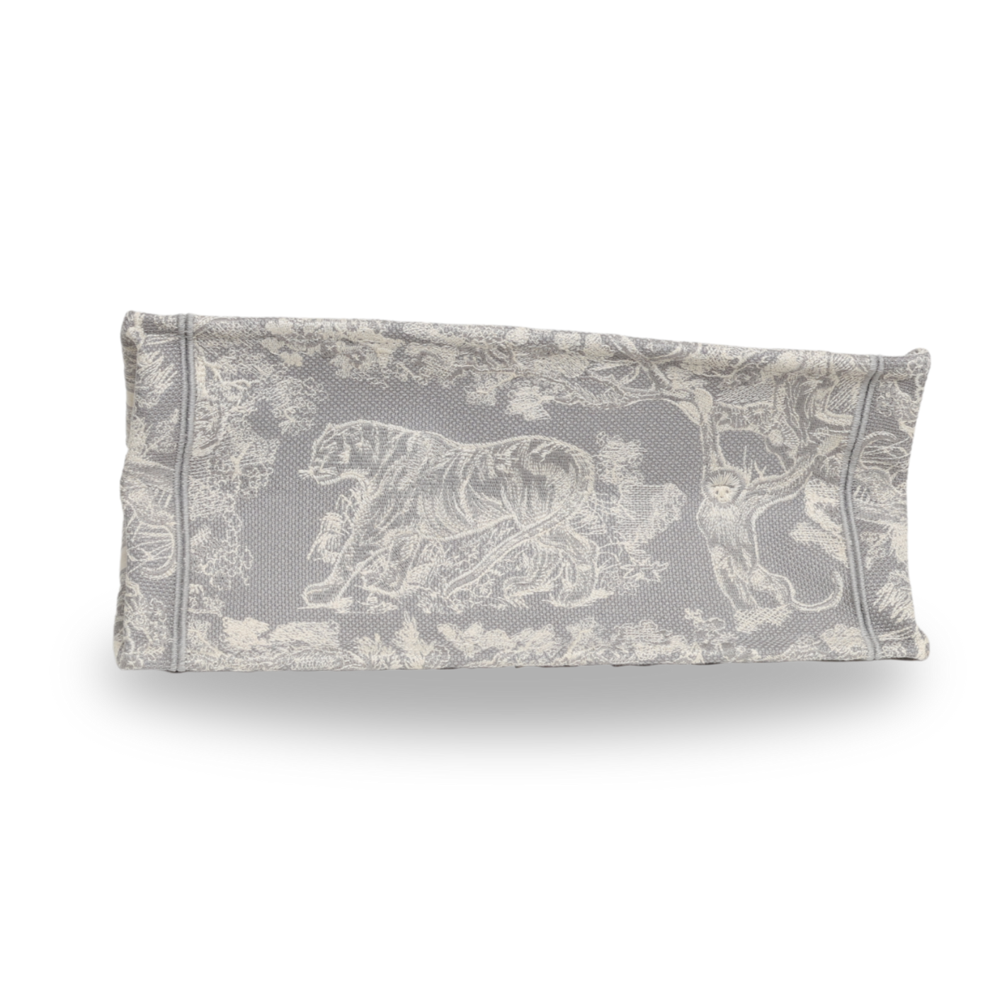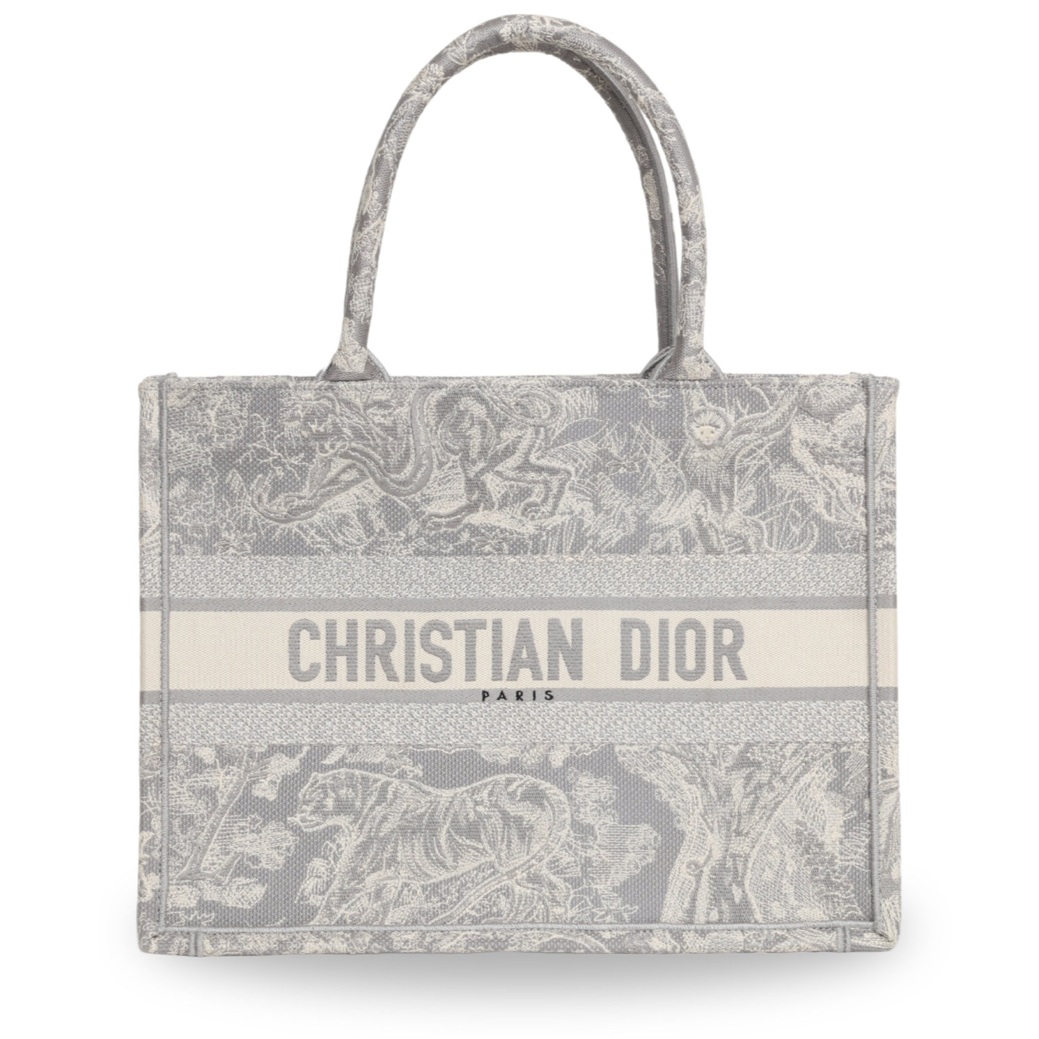 This is an authentic CHRISTIAN DIOR Canvas Embroidered Medium Dioriviera Toile De Jouy Reverse Book Tote in Gray. This colorful tote is finely crafted of embroidered canvas with a bold jungle graphic in grey. The bag features matching canvas rolled handles, with the CHRISTIAN DIOR logo embroidered across the front. The bag opens to a spacious fabric interior.