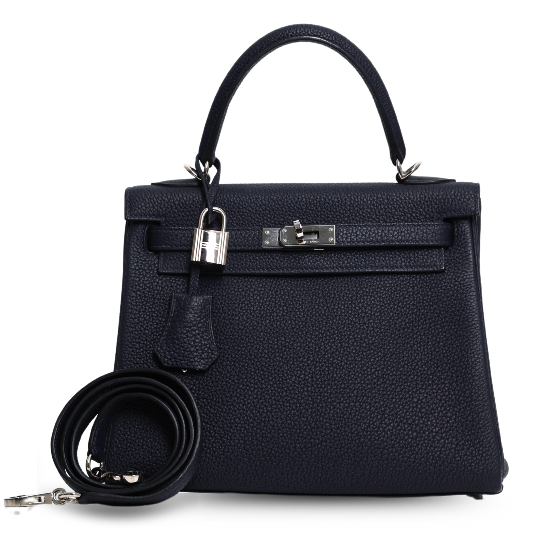 Timelessly elegant and exceptionally versatile, this Hermès Kelly II Retourne 25 in Blue Nuit is the embodiment of refined Parisian craftsmanship. Rendered in luxurious Veau Togo leather, its subtly grained texture offers durability with a soft, supple hand. The deep navy hue—aptly named Blue Nuit—pairs effortlessly with any wardrobe, transitioning seamlessly from day to evening. Accented with gleaming palladium hardware, this piece features the signature Kelly turn-lock closure, a top handle, and a removable leather shoulder strap for convertible carry. The Retourne construction adds a slightly relaxed silhouette, lending a softer, more contemporary feel to this classic shape.