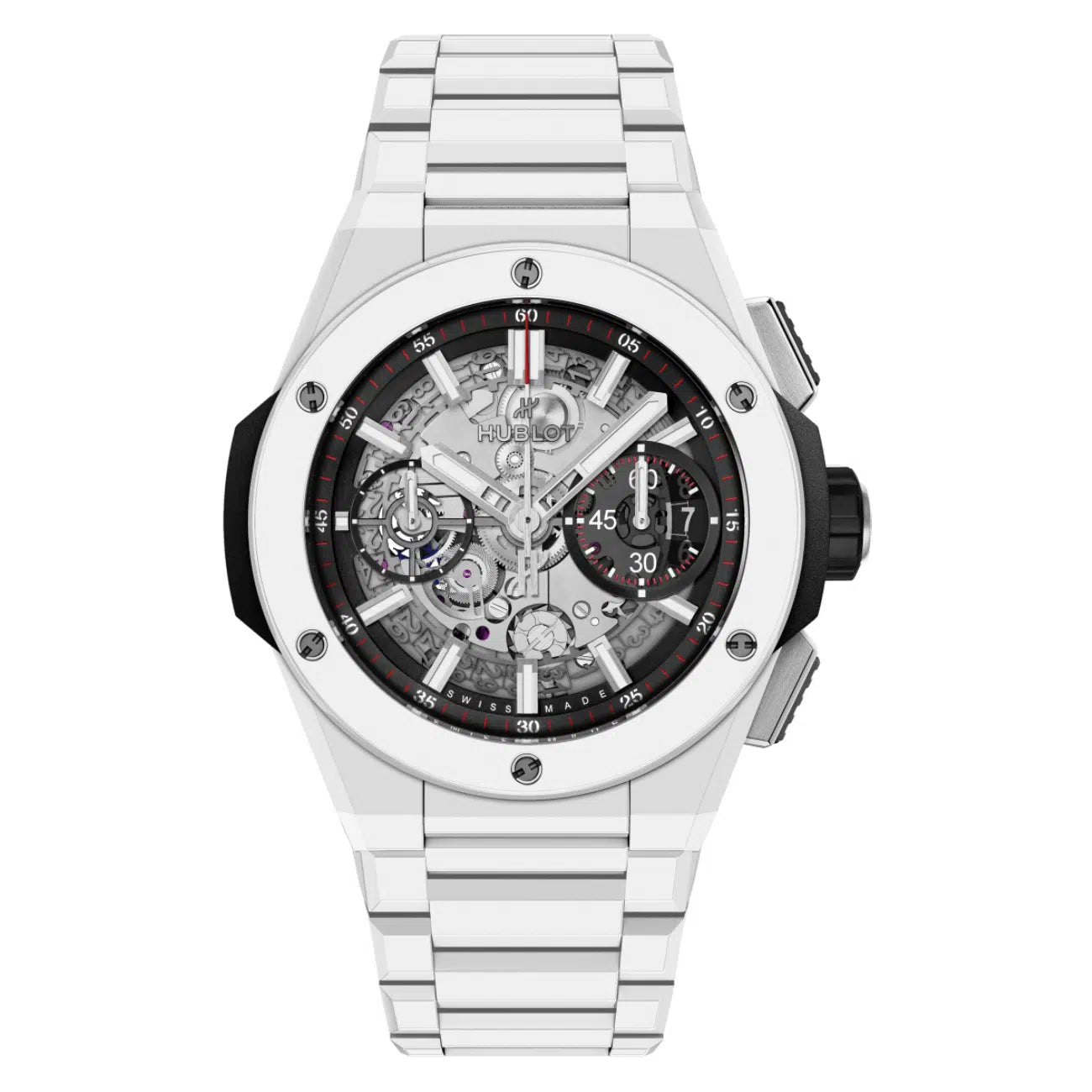 White ceramic case with a white ceramic bracelet. Fixed white ceramic bezel. Mat grey (skeleton center) dial with luminous silver-tone hands and index hour markers. Arabic numeral minute markers (at 5 minute intervals). Minute markers around the outer rim. Dial Type: Analog. Luminescent hands and markers. Date display between 4 and 5 o'clock position. Chronograph - two sub-dials displaying: 60 minute and 60 second. Hublot calibre HUB1280 automatic movement, containing 43 Jewels, composed of 354 parts, bitting at 28800 vph, and has a power reserve of approximately 72 hours.