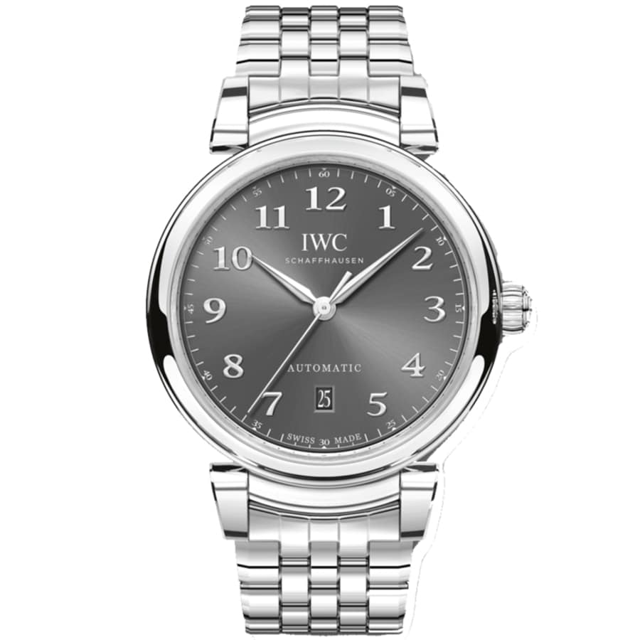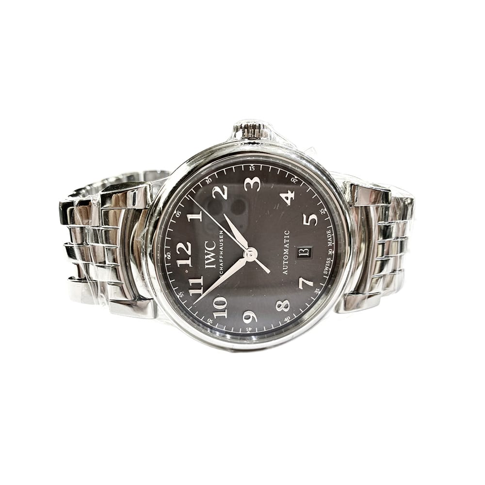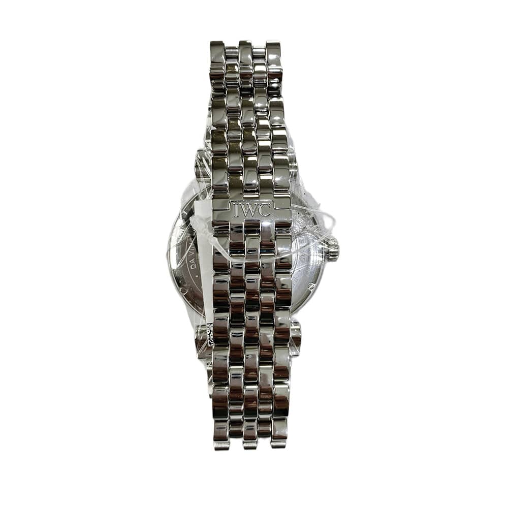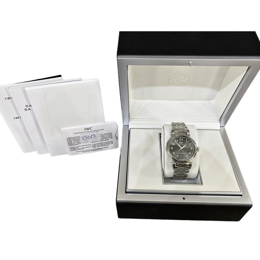 Stainless steel case with a stainless steel bracelet. Fixed stainless steel bezel. Slate dial with silver-tone hands and Arabic numeral hour markers. Minute markers around the outer rim. Dial Type: Analog. Date display at the 6 o'clock position. IWC calibre 35111 automatic movement with a 42-hour power reserve. Scratch resistant mineral crystal.