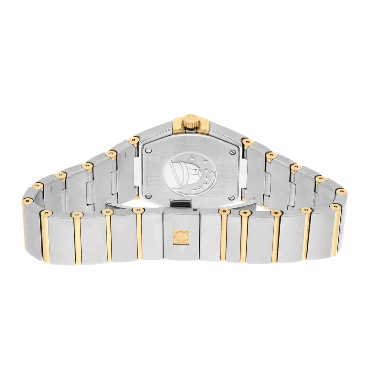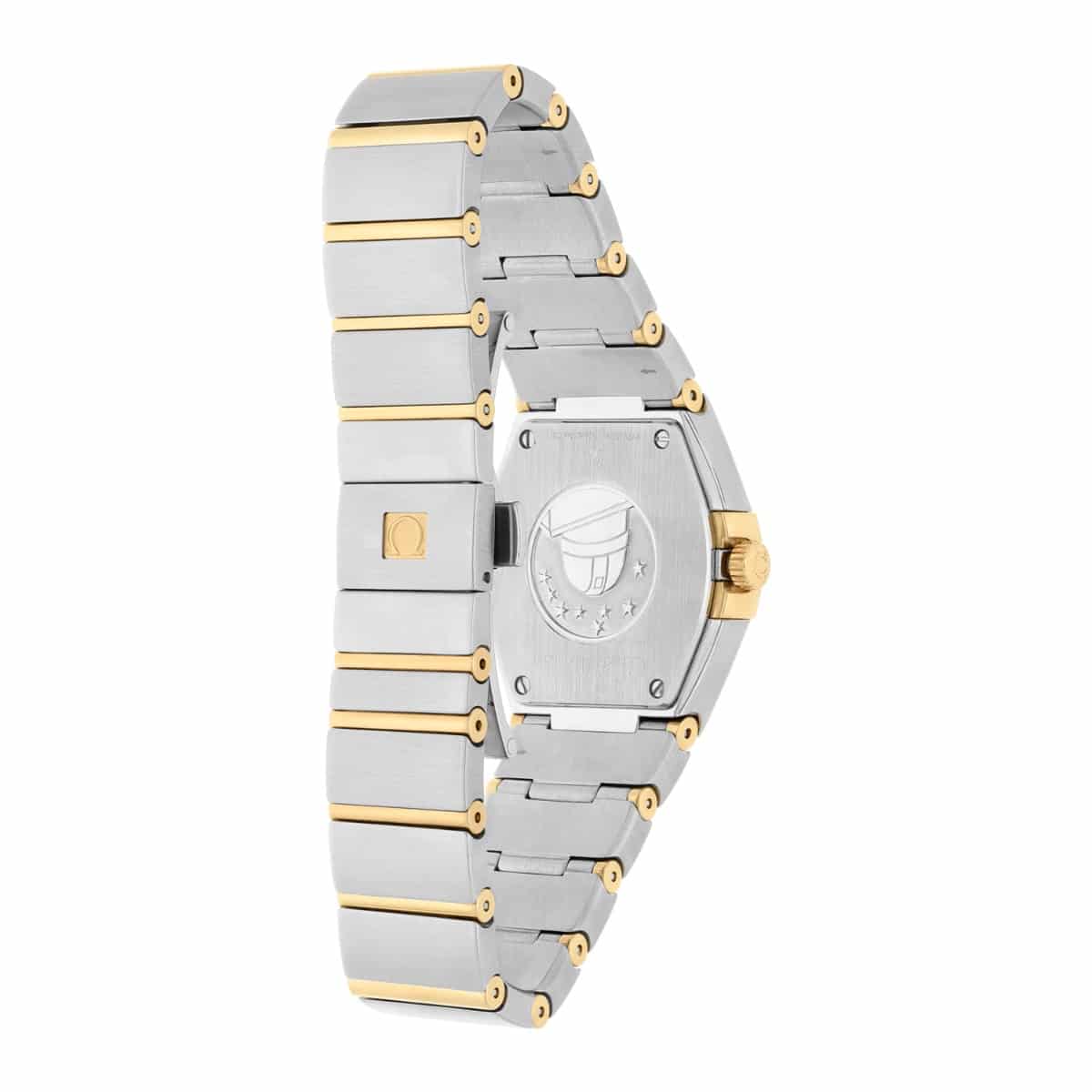 27 mm polished stainless steel and 18K yellow gold case, domed scratch-resistant sapphire crystal with anti-reflective treatment inside, white mother-of-pearl dial with diamond hour markers, quartz Omega 1376 movement, approximately 32 months of power reserve, stainless steel and 18K yellow gold bracelet.