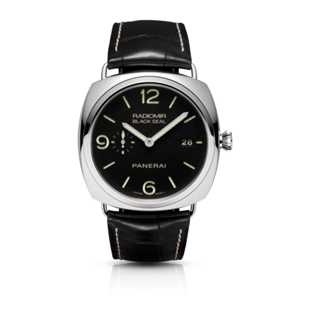 The Panerai Radiomir Black Seal 3 Days Automatic (PAM00388) is a stylish and robust timepiece featuring a 45mm stainless steel cushion-shaped case with a sapphire open case back. It is powered by the Panerai caliber P.9000 movement, offering hours, minutes, small seconds, and date functions.